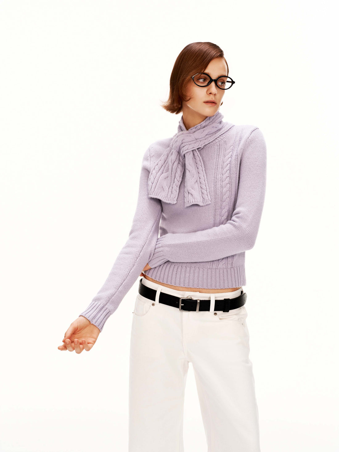 Asymmetrical Scarf Cable-Knit Wool Sweater