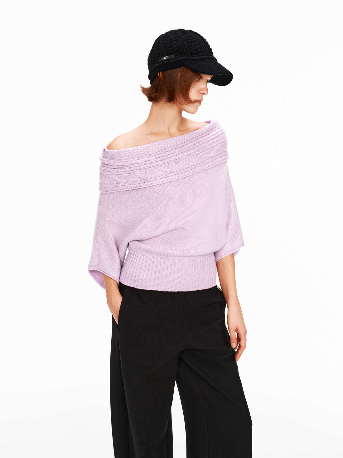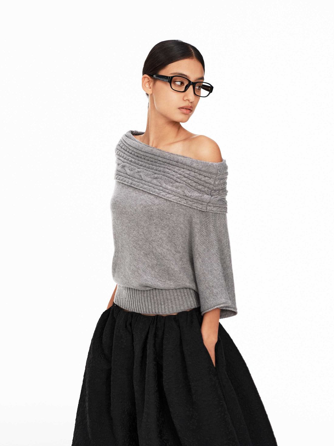 70s-Inspired Cable Knit Off-Shoulder Sweater