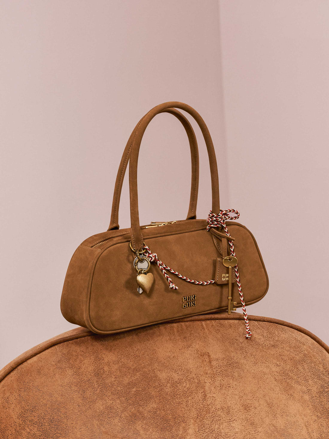 Vintage Suede Leather Boston Bag with Grained Cowhide