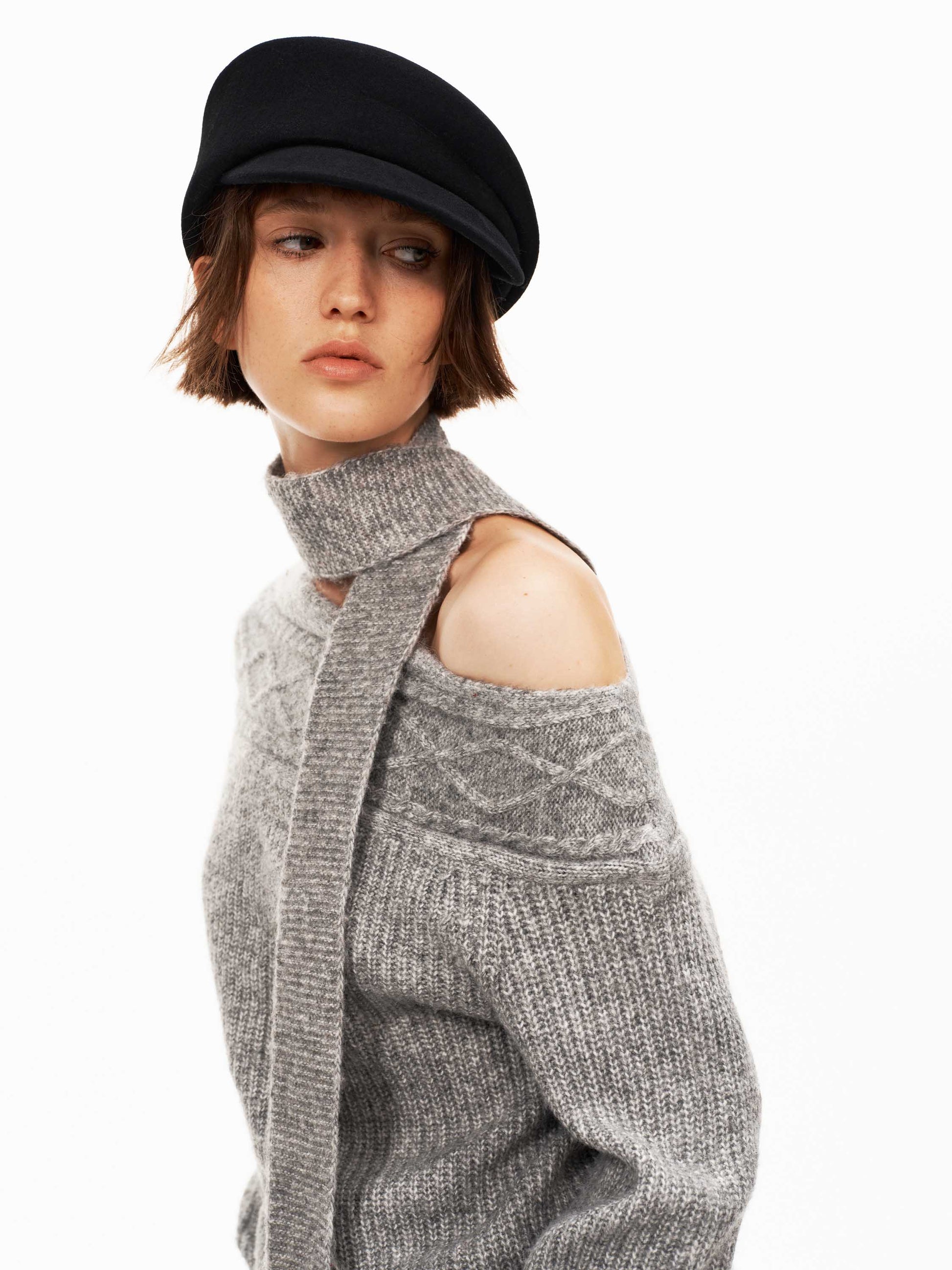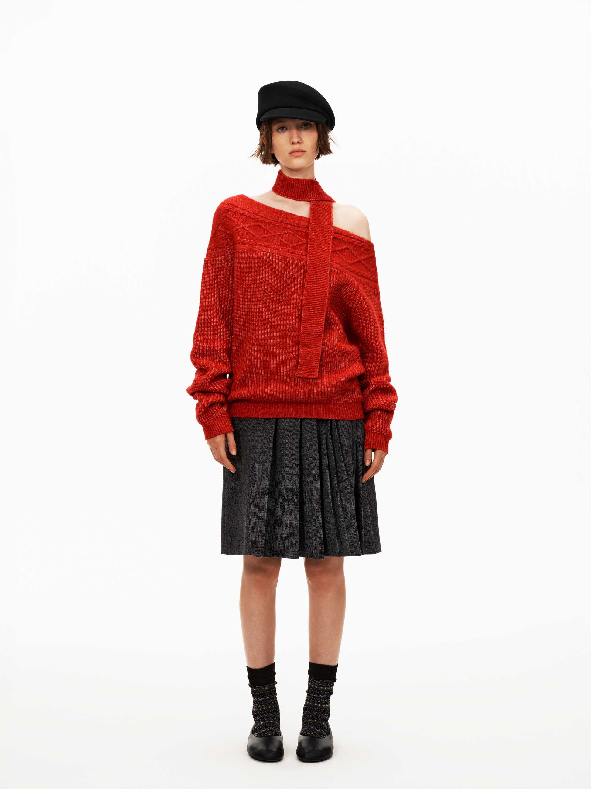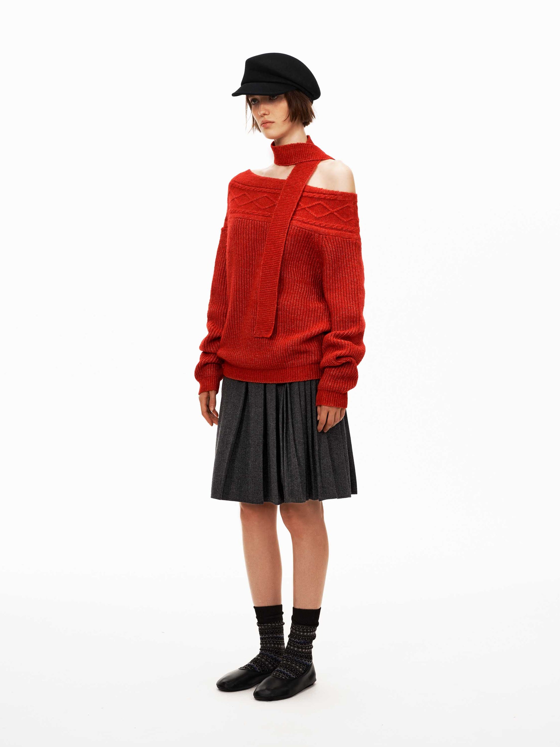 The off-shoulder cut with a detachable scarf elegantly frames the neckline for a flattering silhouette.