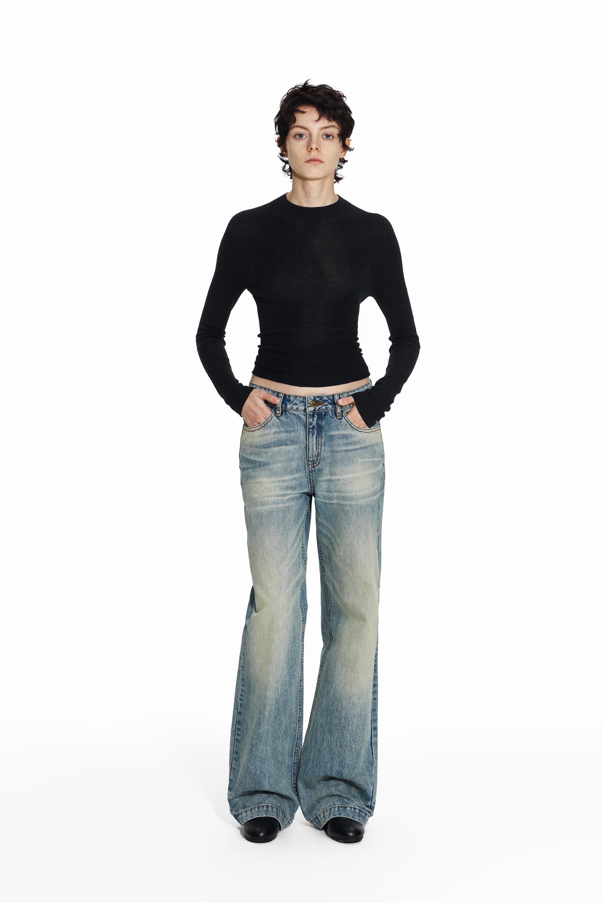 The vintage wash in a retro-inspired shade brings strong nostalgic character and modern style. Through multiple ice washes and detailed hand-sandblasted whisker effects, the jeans achieve a richly layered, high-contrast finish with distinct blue-white variations.