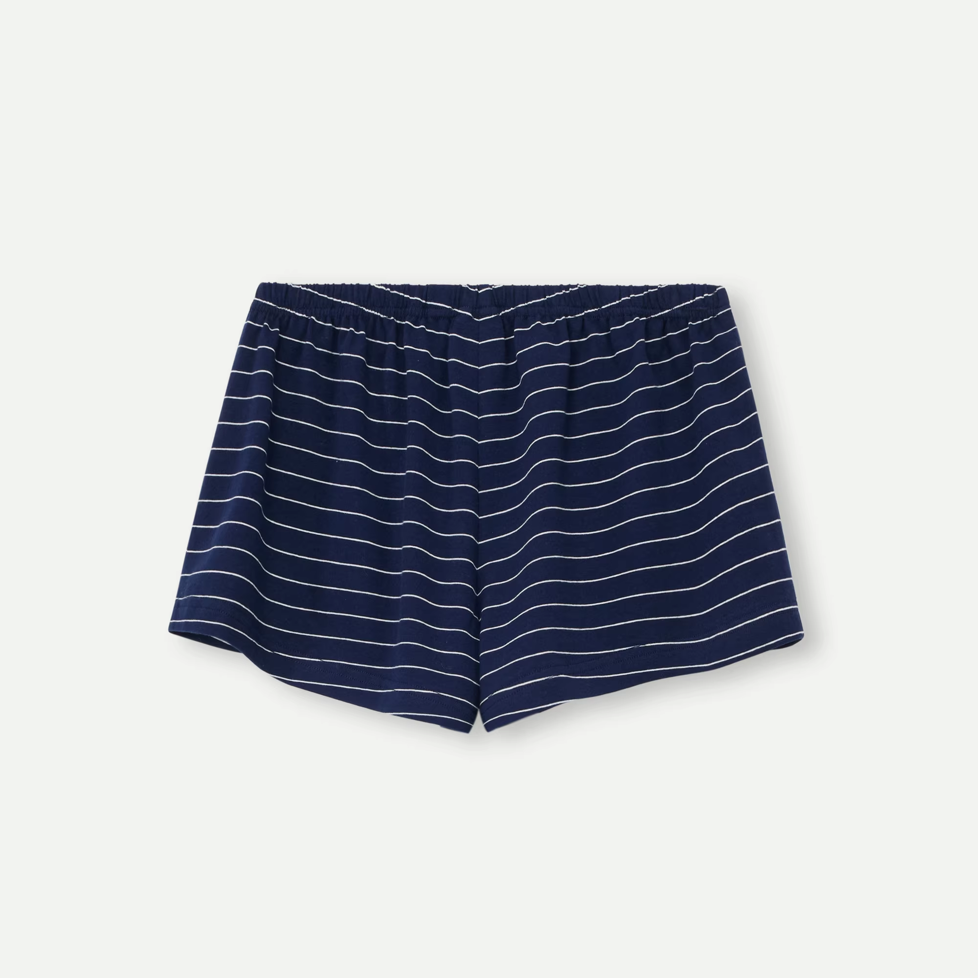Quiet details: A refined striped knit set composed of a slim-fit long-sleeve top and matching tailored shorts. The top follows the body with a clean, body-skimming cut that subtly defines the silhouette, while a contrast logo embroidery at the chest adds a quiet point of detail. The shorts are cut with a neat, fitted shape to gently refine the leg line, maintaining balance and ease throughout the set.