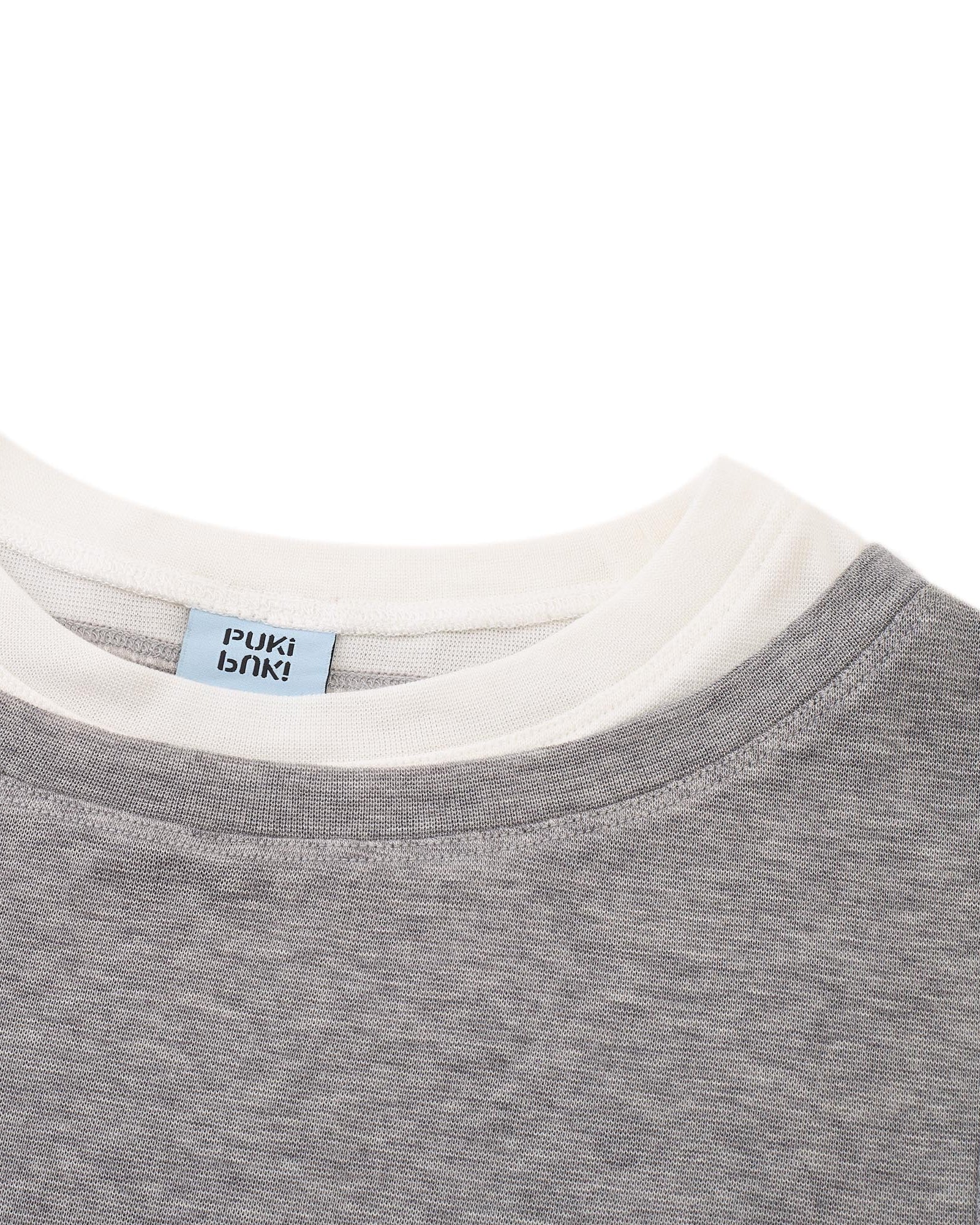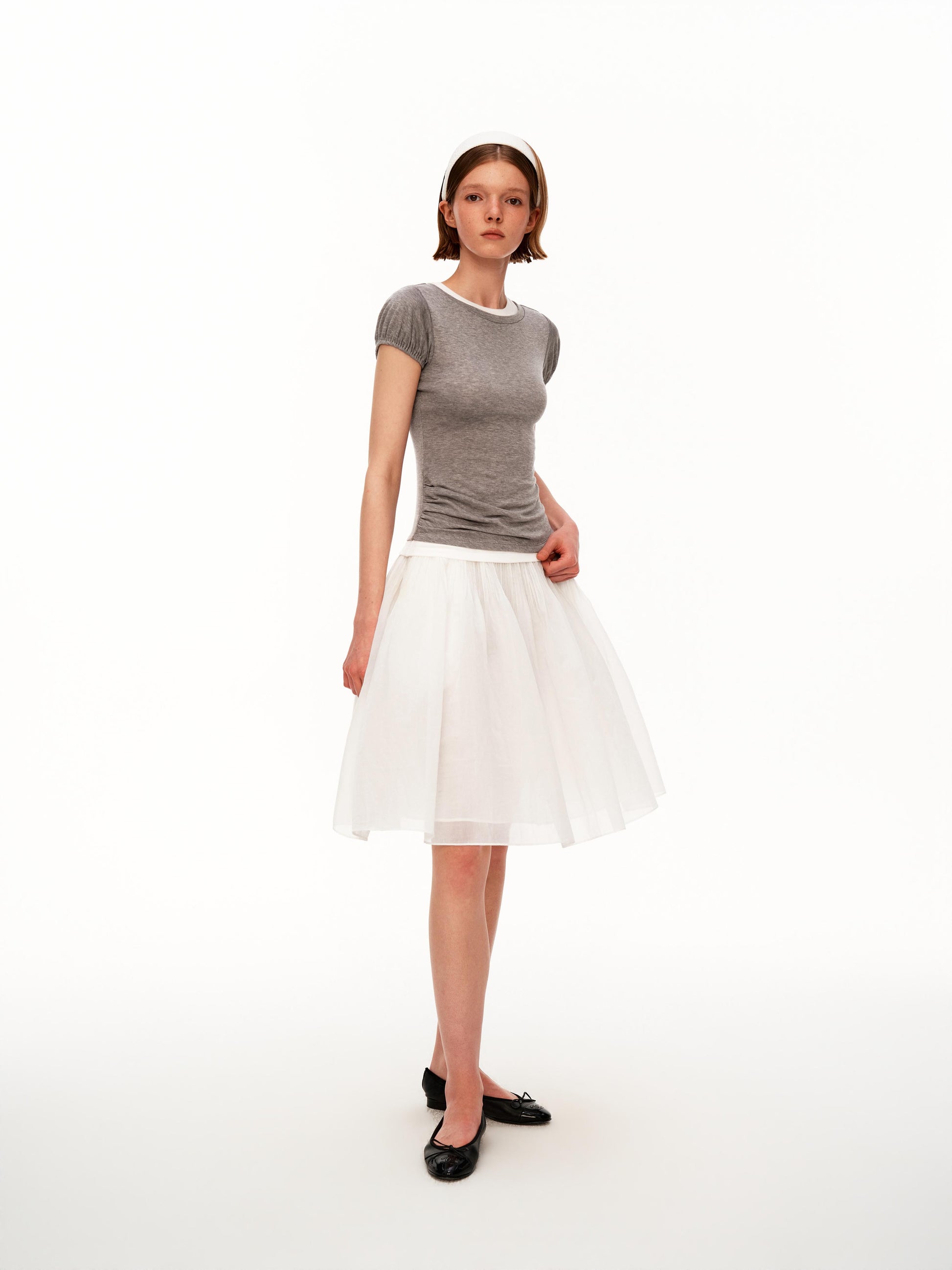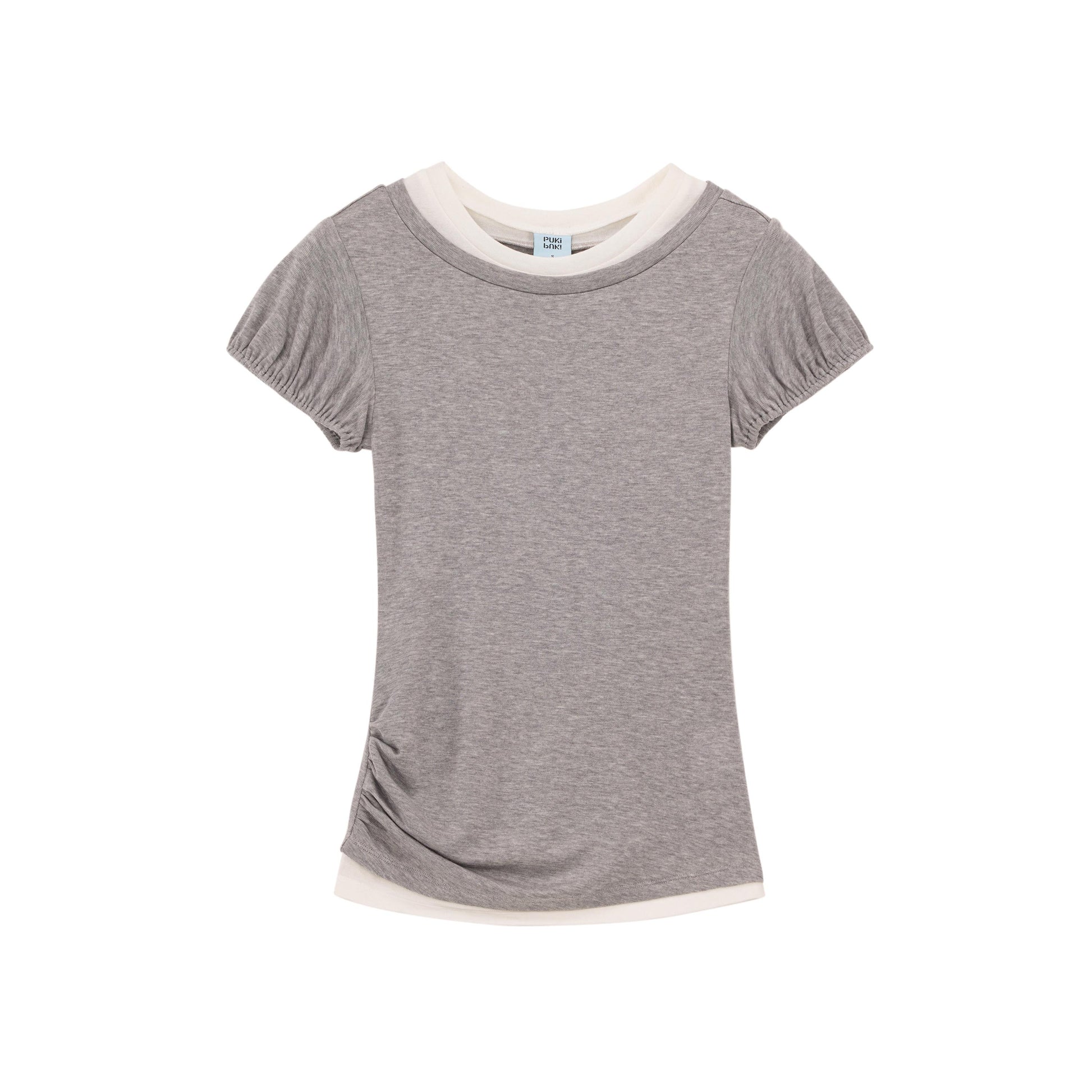 Quiet details: A softly structured knit top designed with a contrast layered effect, creating the illusion of a two-piece look. Crafted in a lightweight Lyocell-wool blend, the fabric feels smooth and breathable against the skin. The gently puffed sleeves add a soft, feminine volume, while the ruched waist subtly defines the silhouette for a flattering, sculpted shape. Balanced between elegance and ease, it brings a refined yet playful touch to everyday styling.