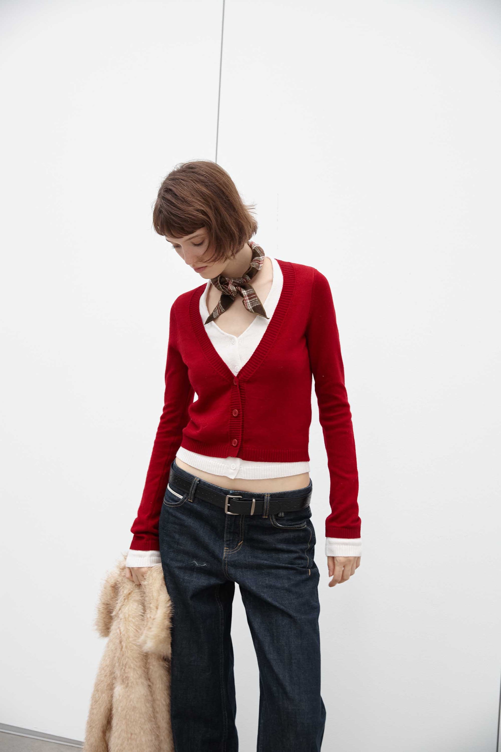 Contrast Layered V-Neck Wool-Blend Cardigan Top