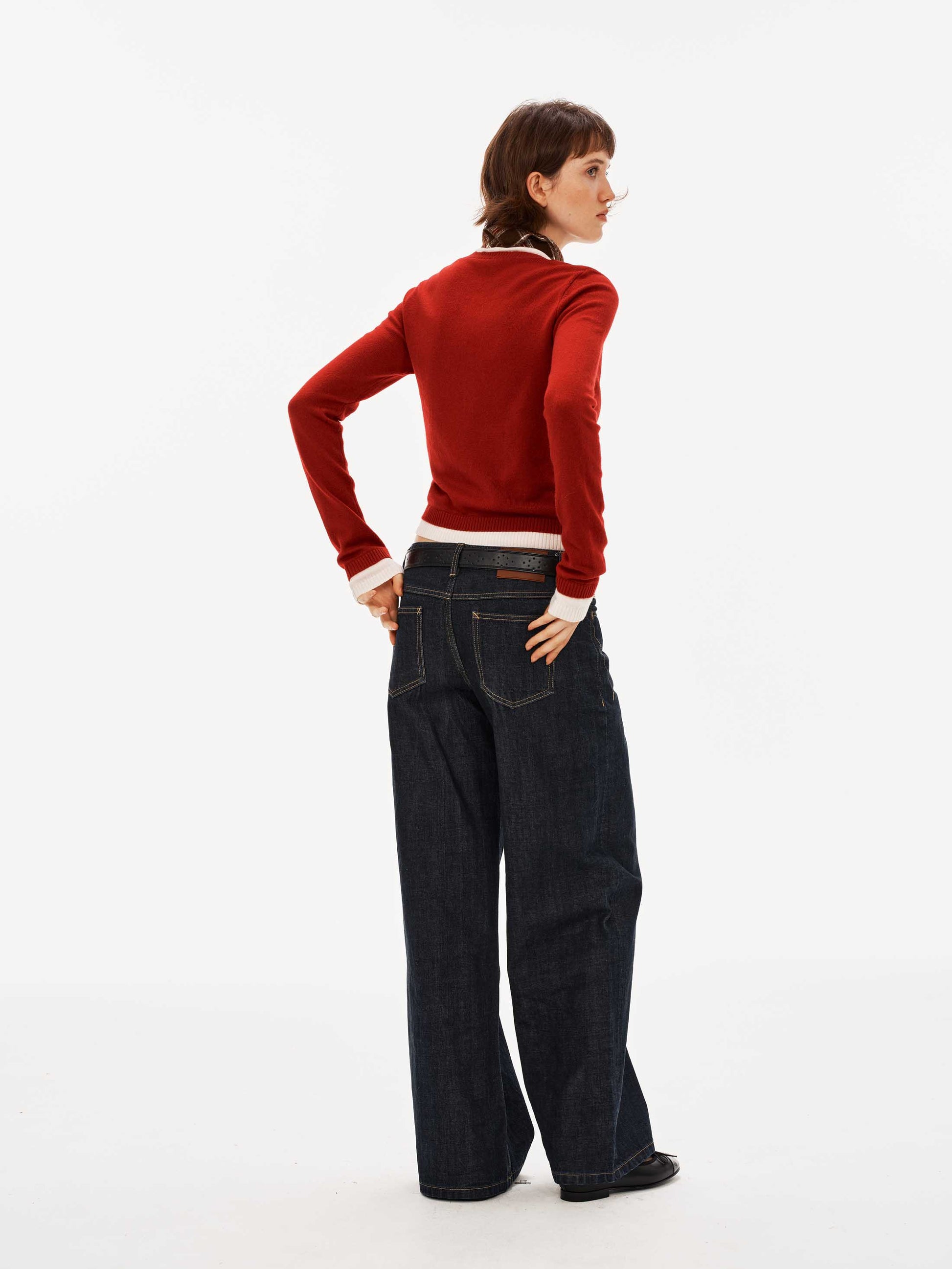 Quiet details:A fitted wool-blend cardigan with a striking V-neckline and layered collar construction. Contrast cuffs and hem create visual depth while the tailored cut flatters the silhouette with understated sophistication.