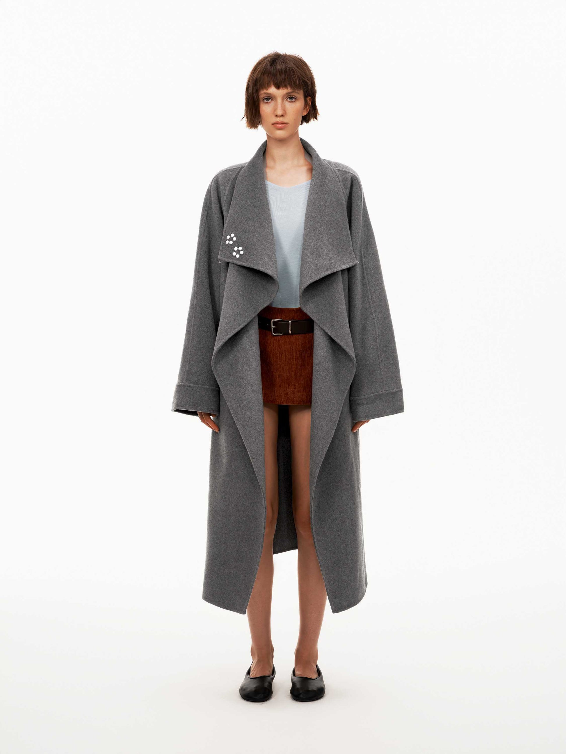 Its one-piece collar and placket construction ensures a seamless, sculpted drape.