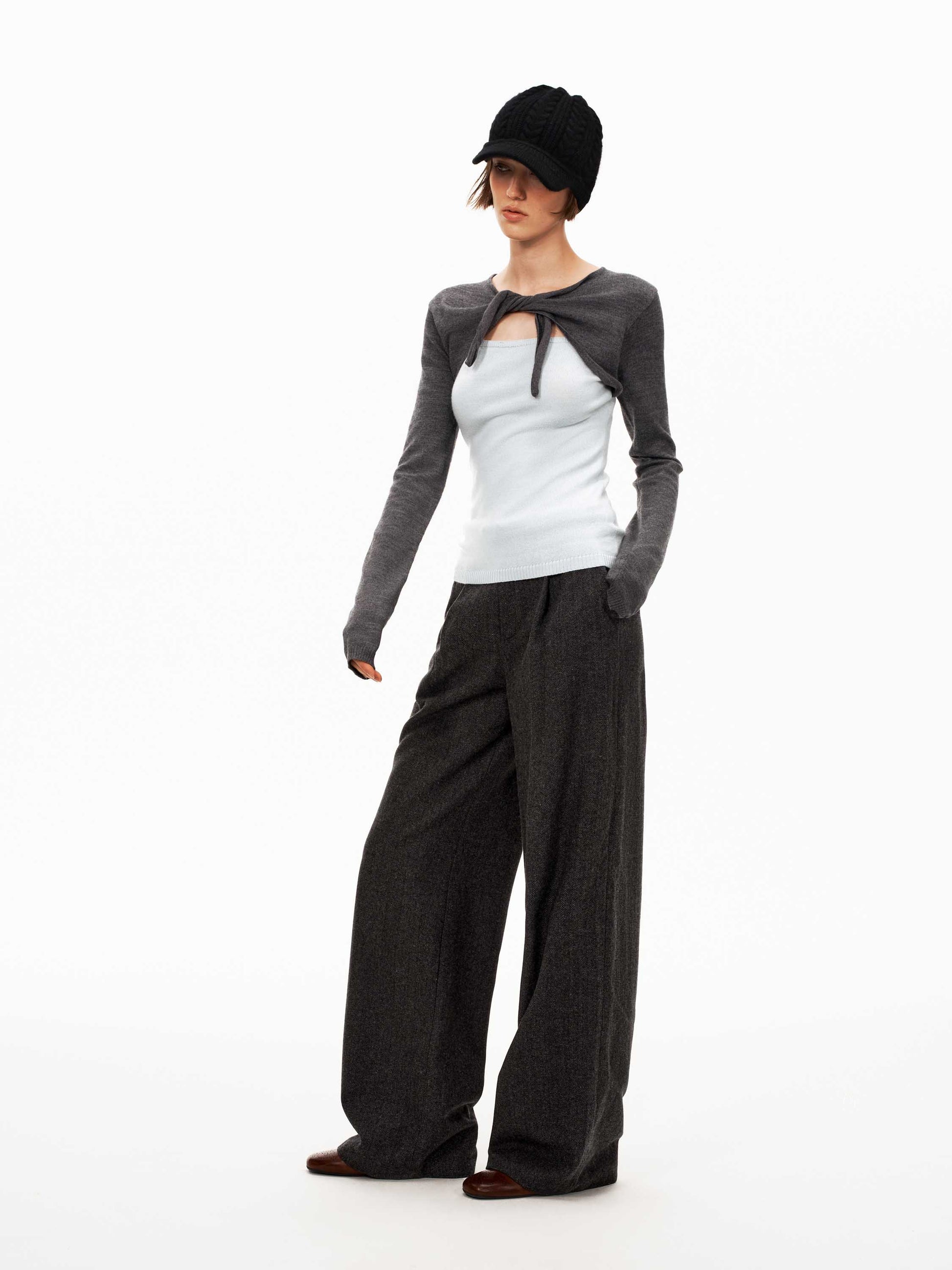 Description: A soft, fitted knit top made from fine Merino wool with a playful faux two-piece design. The contrast color panels and tie-front detail add a modern, layered touch, while the lightweight elastic fabric ensures warmth and comfort without bulk.