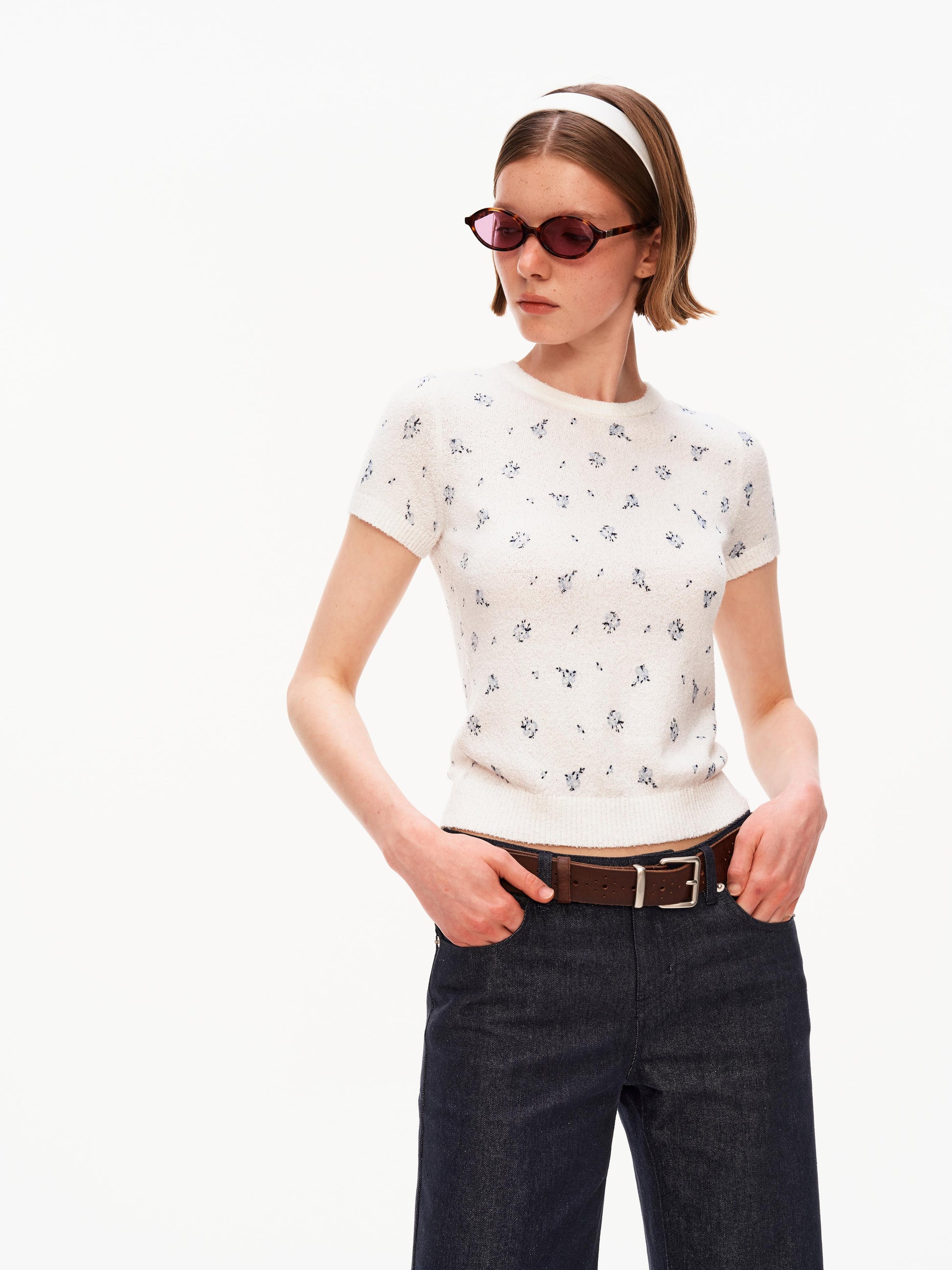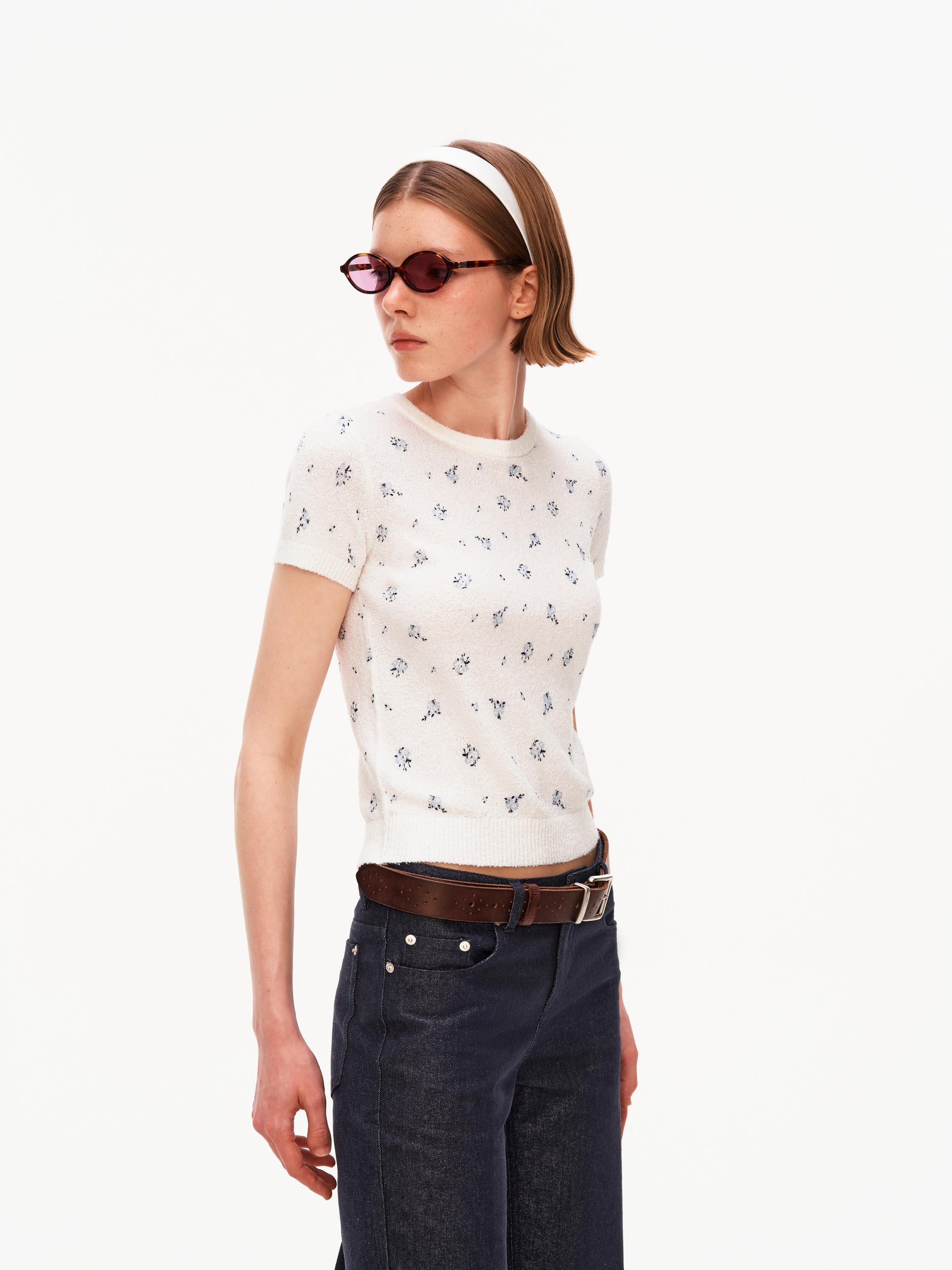 Quiet details: A softly textured knit tee crafted from bouclé yarn, featuring a delicate floral pattern that brings a fresh, understated charm. The structured ribbed trims keep the silhouette neat and resilient, while the lightweight knit offers breathable comfort. Relaxed yet polished, it’s designed as an elevated everyday piece that pairs effortlessly with tailoring, denim, or skirts.