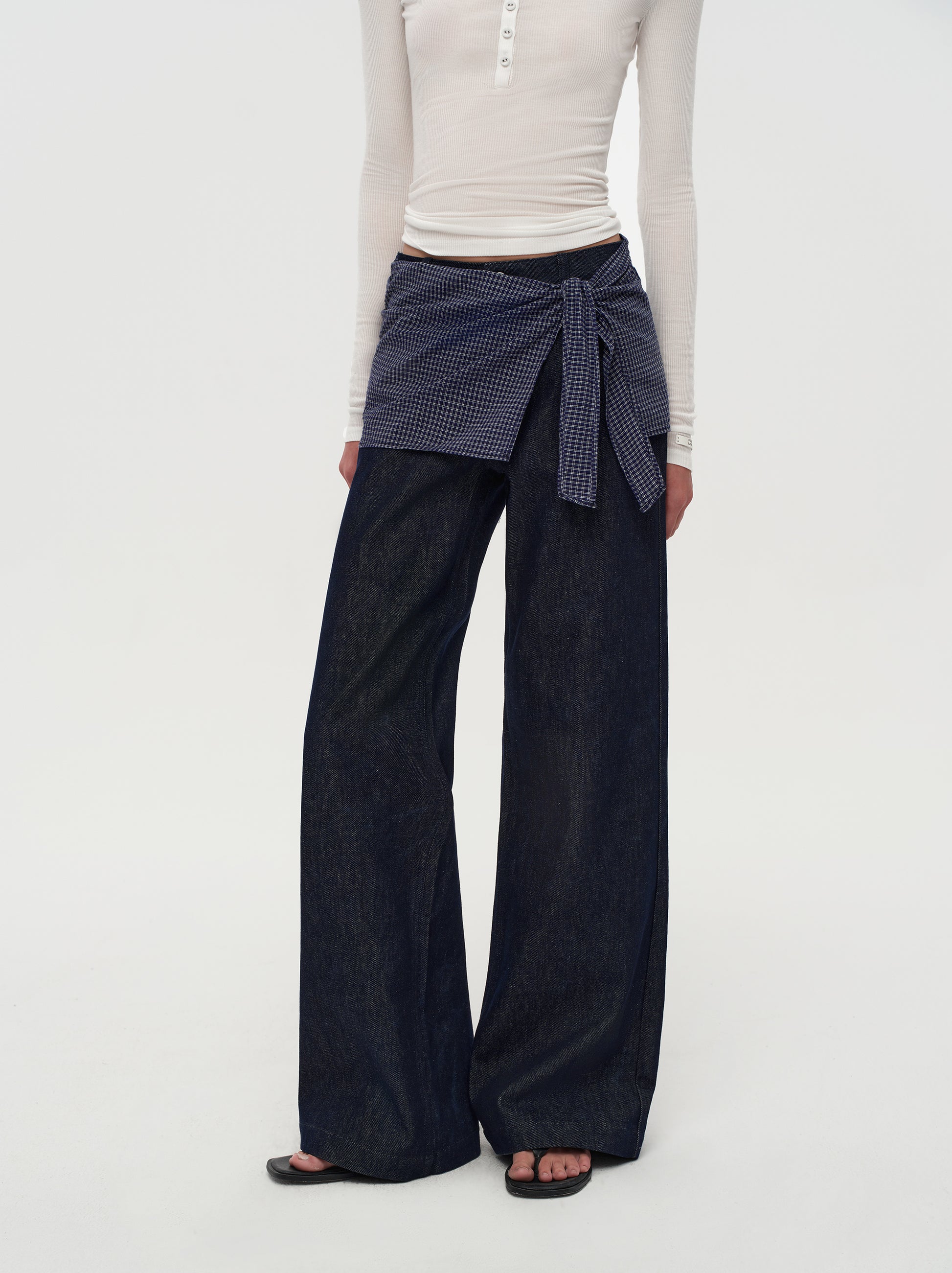 Quiet details: These straight-leg jeans feature a relaxed, structured fit that flatters every silhouette. The adjustable gingham waist tie adds a subtle preppy accent — perfect for layering with knits or crisp white shirts. Soft yet durable denim offers lasting comfort, making it your go-to piece from weekday brunches to weekend strolls.