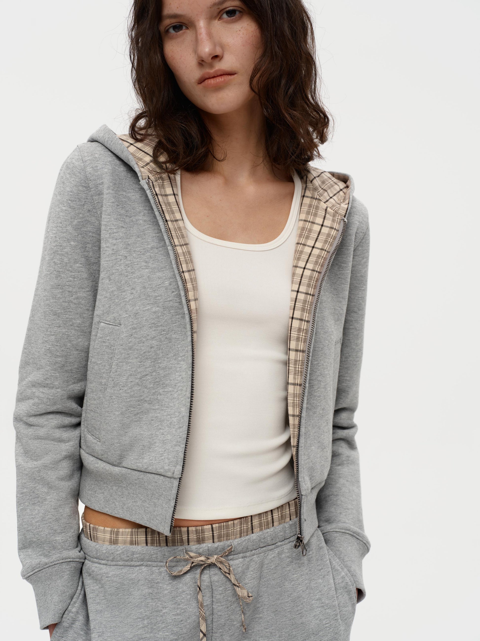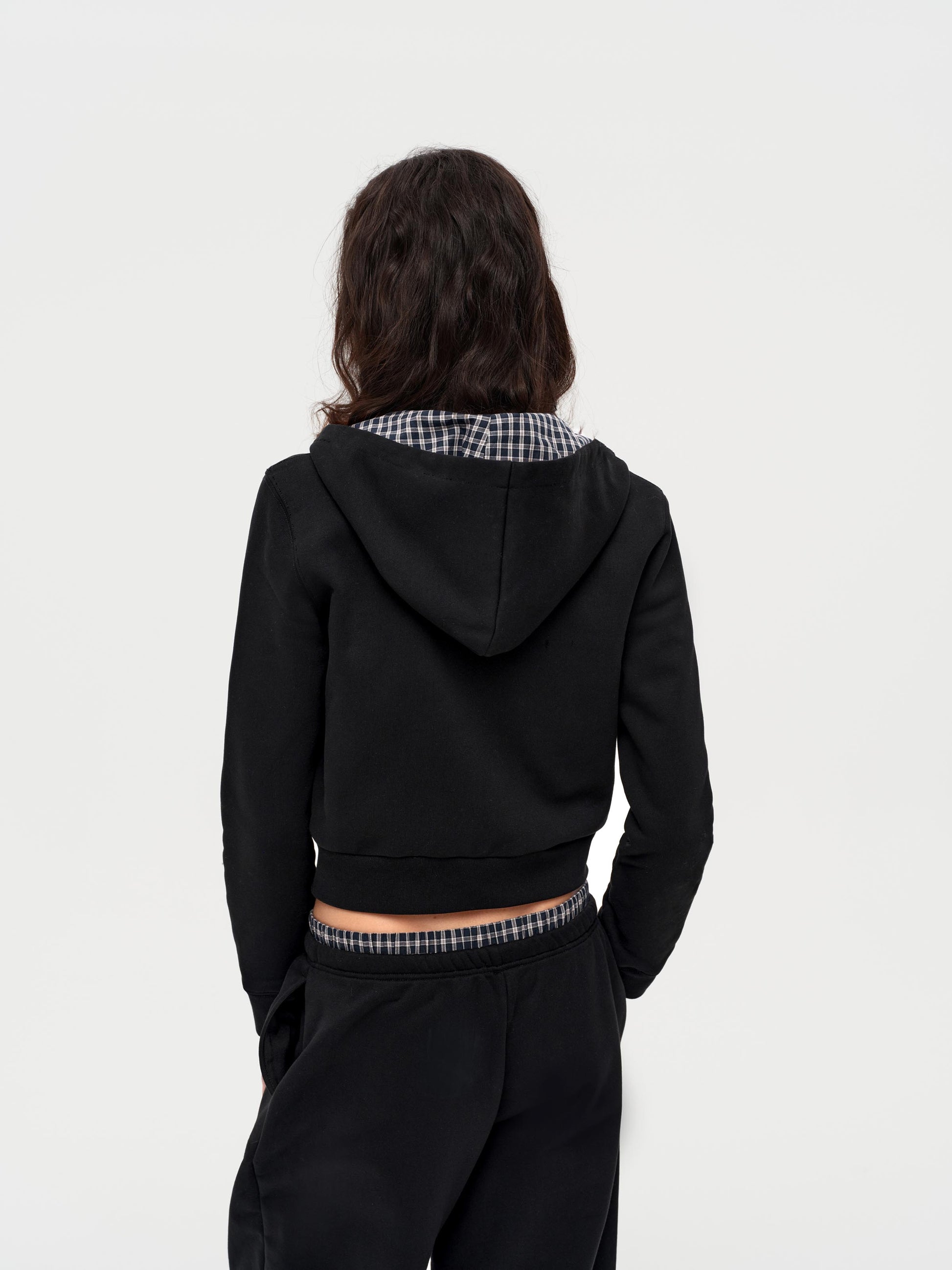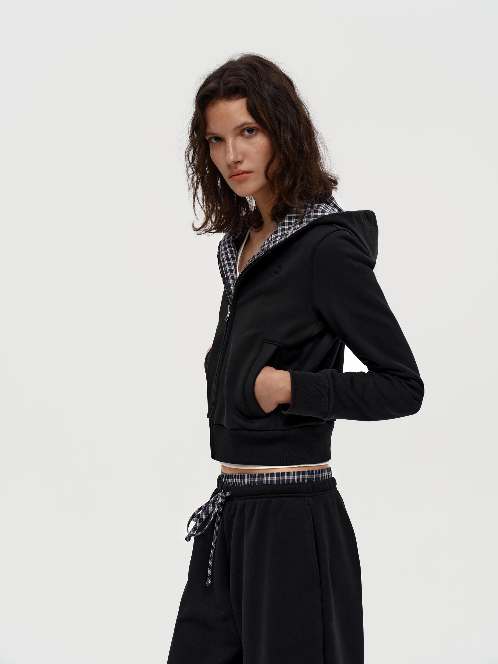 Crop Hoodie with tailored fit and subtle waist cut-out. Features a hooded crop style, heavyweight cotton blend for softness and structure, and a checkered panel on the hood. Choose from two colors: Gray with yellow checks for a relaxed vibe, or Black with blue checks for versatile casual wear. Embroidered logo at chest. Perfect as an easy-going set — just throw it on and go.