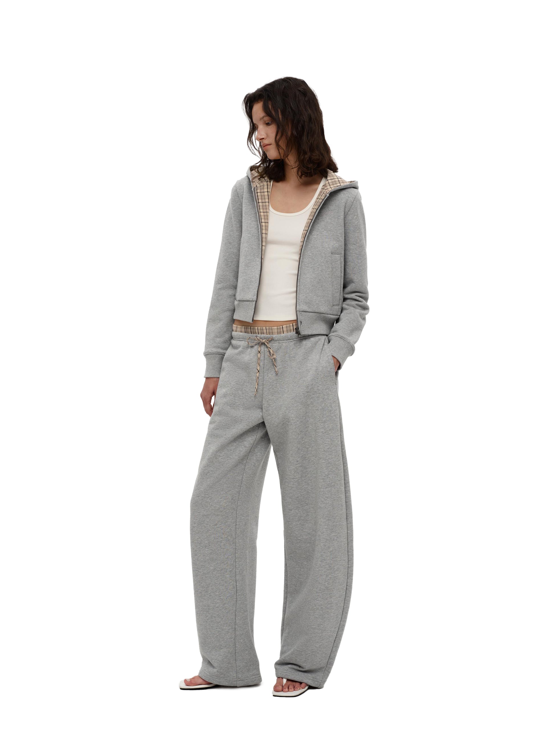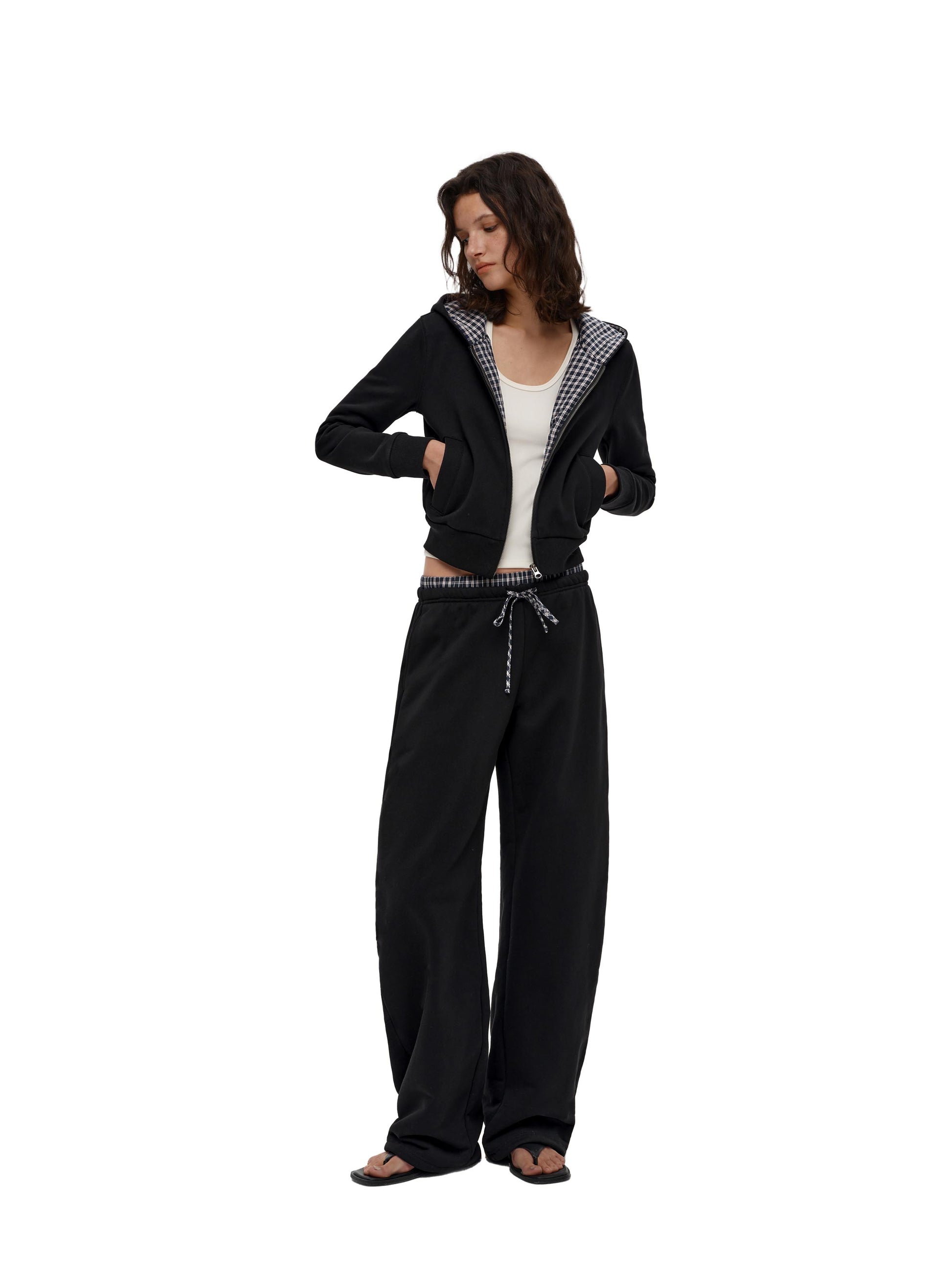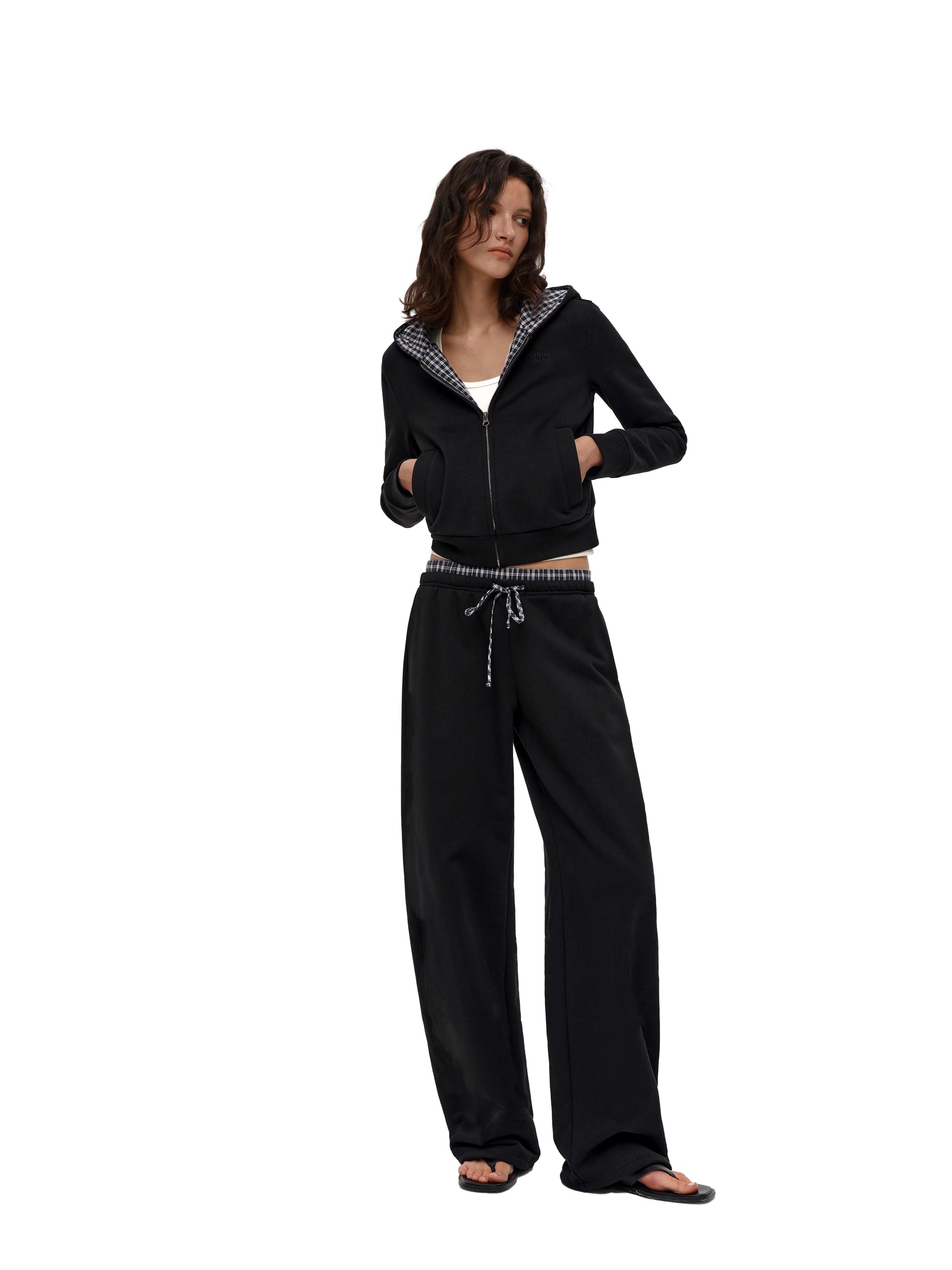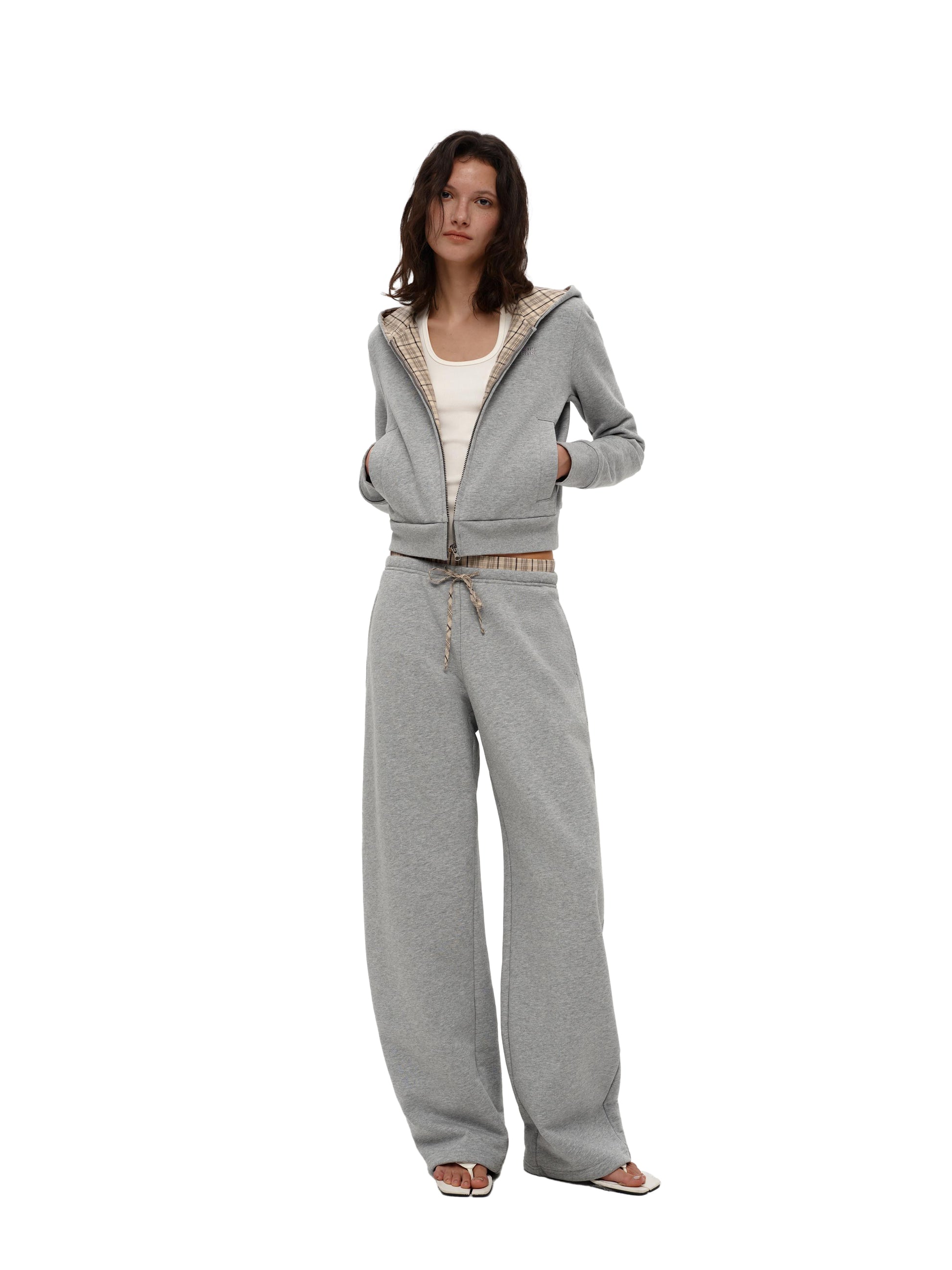 Crop Hoodie with tailored fit and subtle waist cut-out. Features a hooded crop style, heavyweight cotton blend for softness and structure, and a checkered panel on the hood. Choose from two colors: Gray with yellow checks for a relaxed vibe, or Black with blue checks for versatile casual wear. Embroidered logo at chest. Perfect as an easy-going set — just throw it on and go.