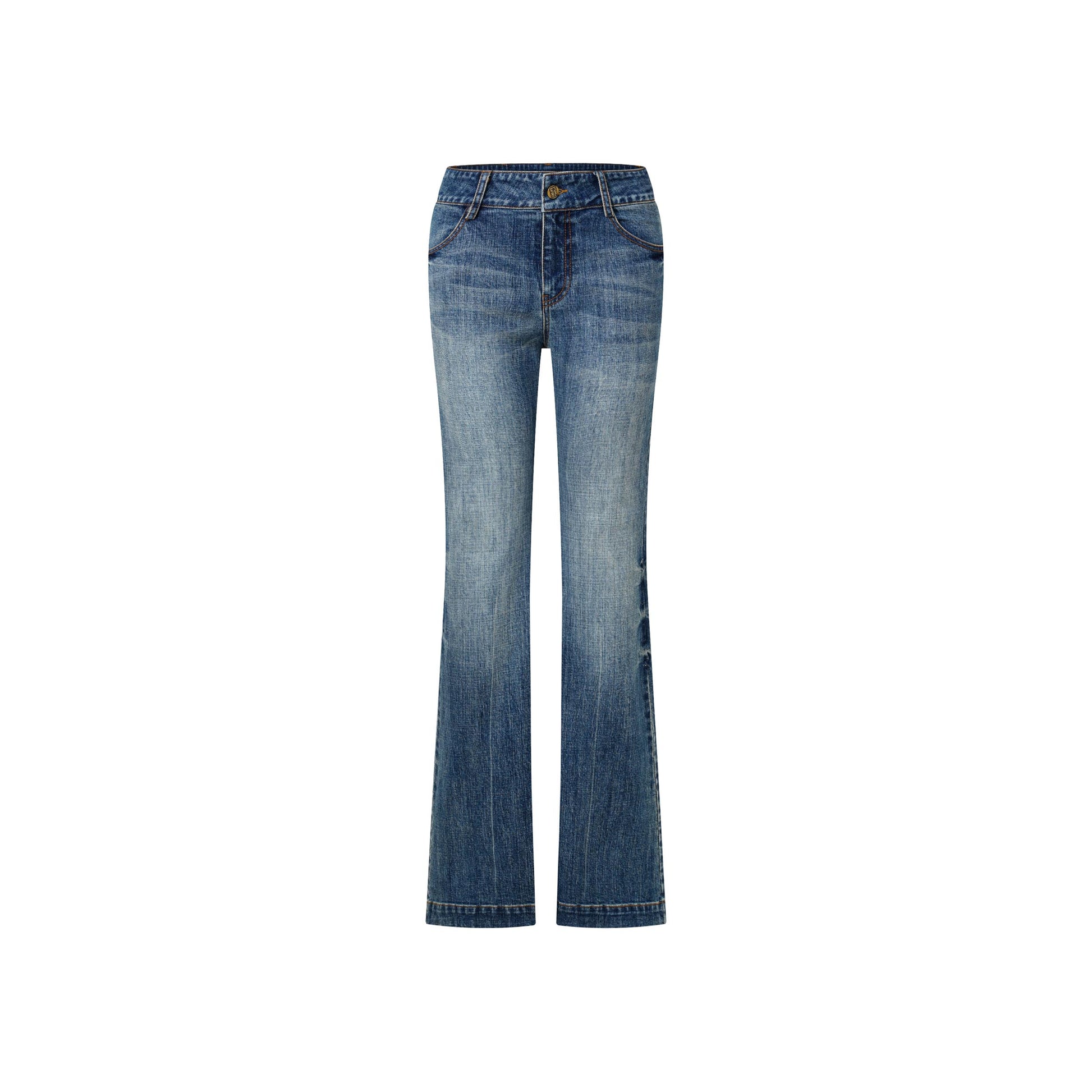 This jeans style features a flared cut that elongates your silhouette and prevents a bulky look in autumn and winter layers. Crafted from deep indigo vertical slub denim (12 oz with slight stretch), the fabric is lightly stone-washed to emphasize a vertical striped texture.