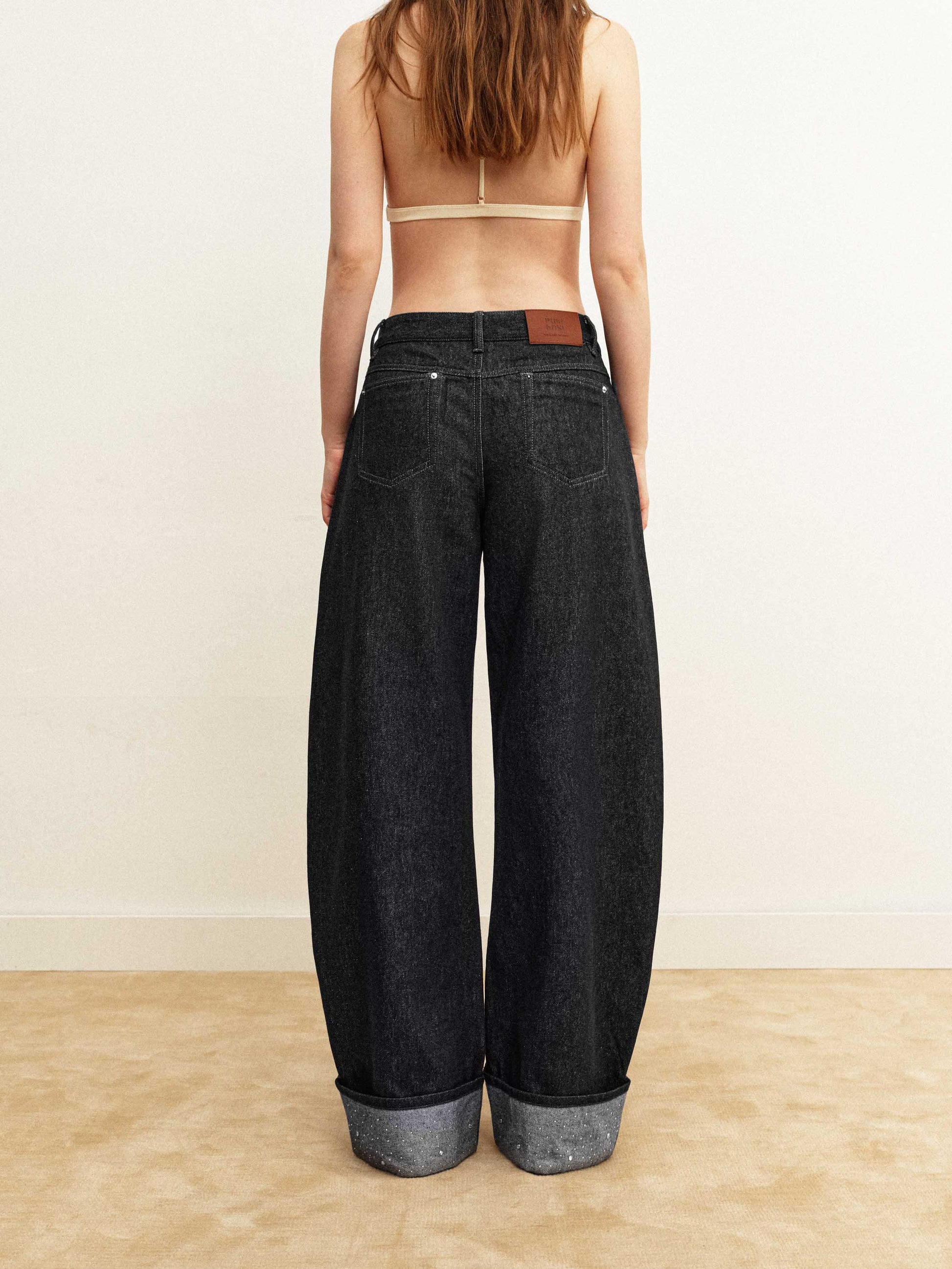 The curved hemline sculpts the silhouette, while the subtle crystal details at the cuff add a refined finish.