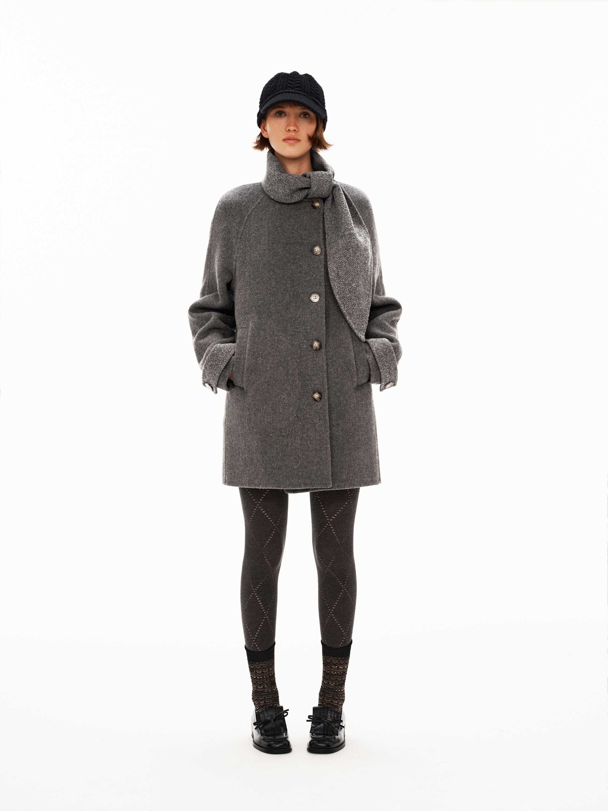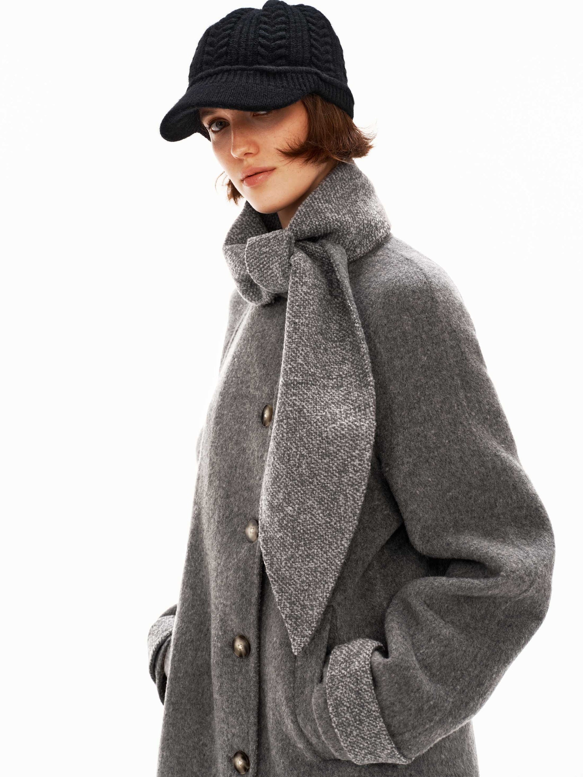 Quiet details: A sophisticated mid-length wool coat with an integrated scarf collar that provides both warmth and visual interest. The reversible double-face fabric showcases contrasting sides, while discreet hardware and textured details create a polished, cohesive aesthetic. Designed to flatter all silhouettes.