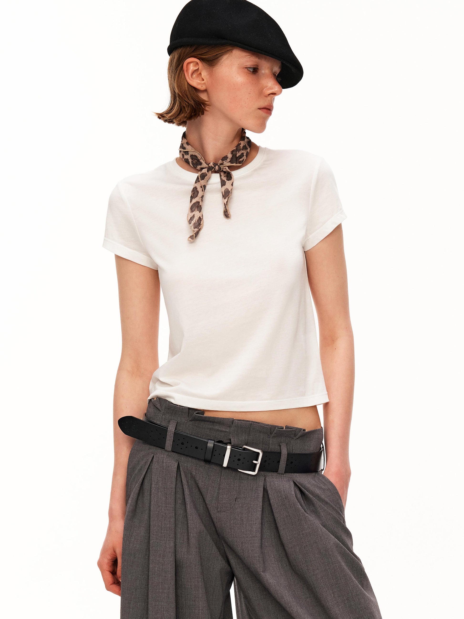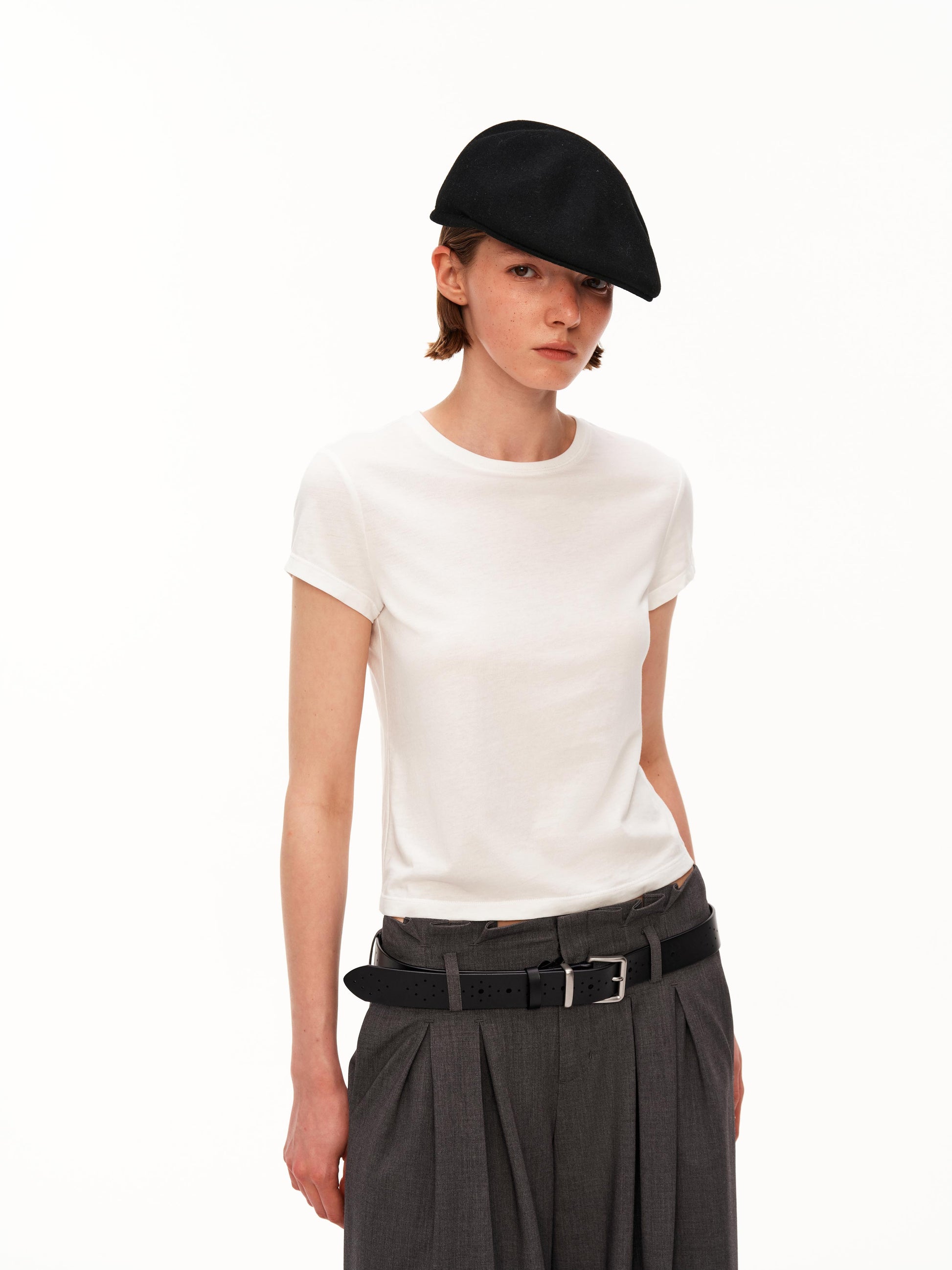 Quiet details: A refined essential tee crafted from a premium modal, cotton, and merino wool blend. The clean round neckline and structured shoulder create a polished silhouette, while the ultra-soft fabric offers breathable comfort against the skin. Minimal yet elevated, it’s designed as a versatile foundation piece that transitions effortlessly between work, leisure, and layering.