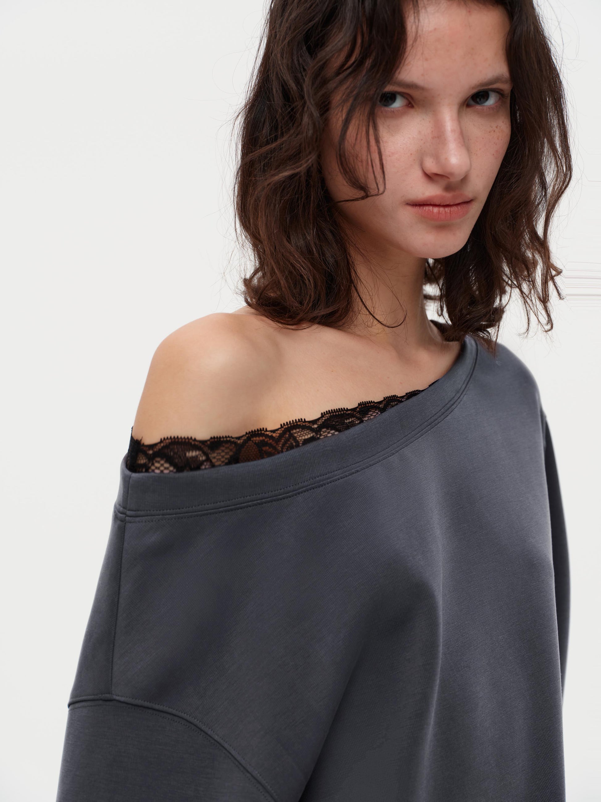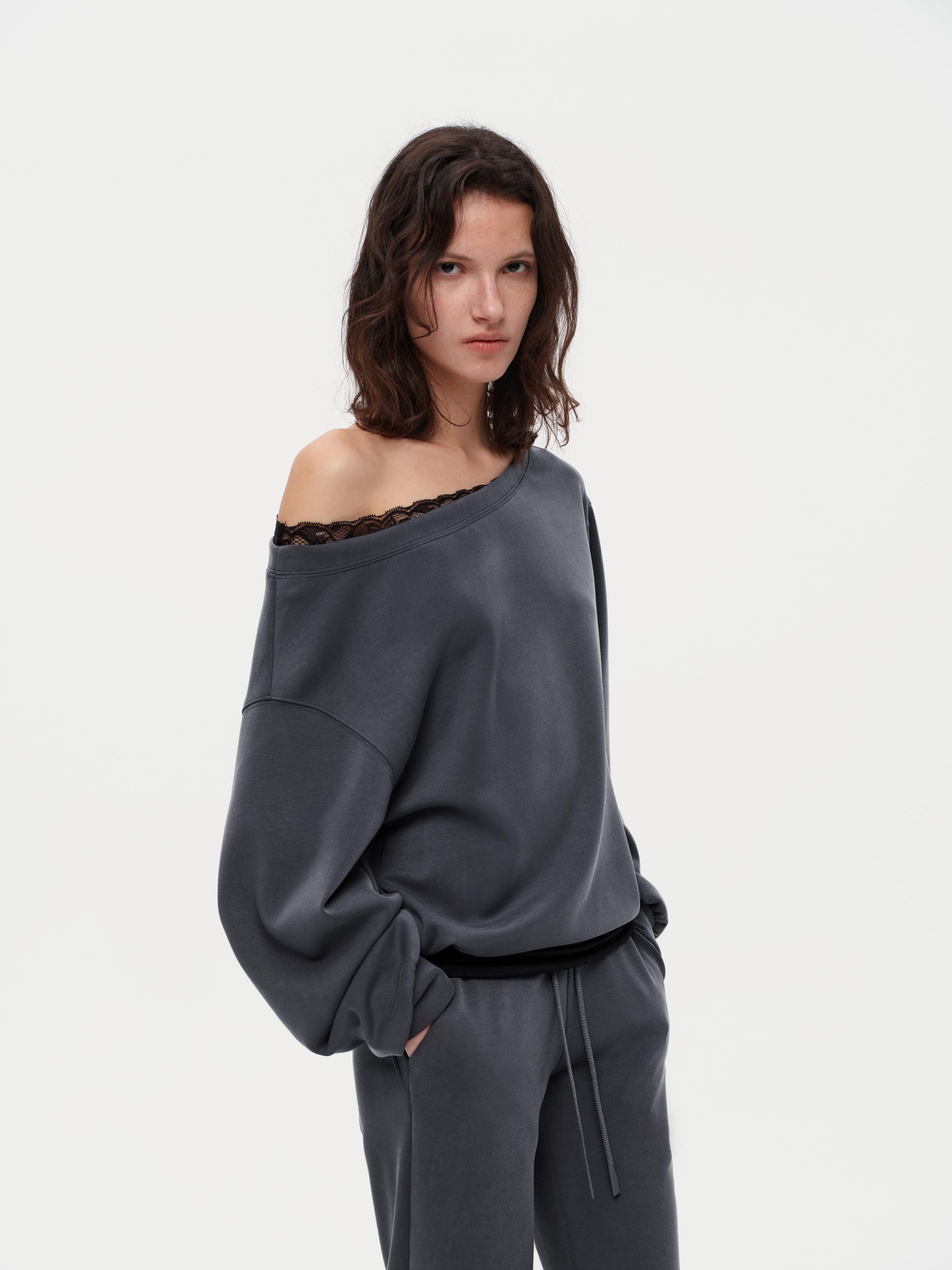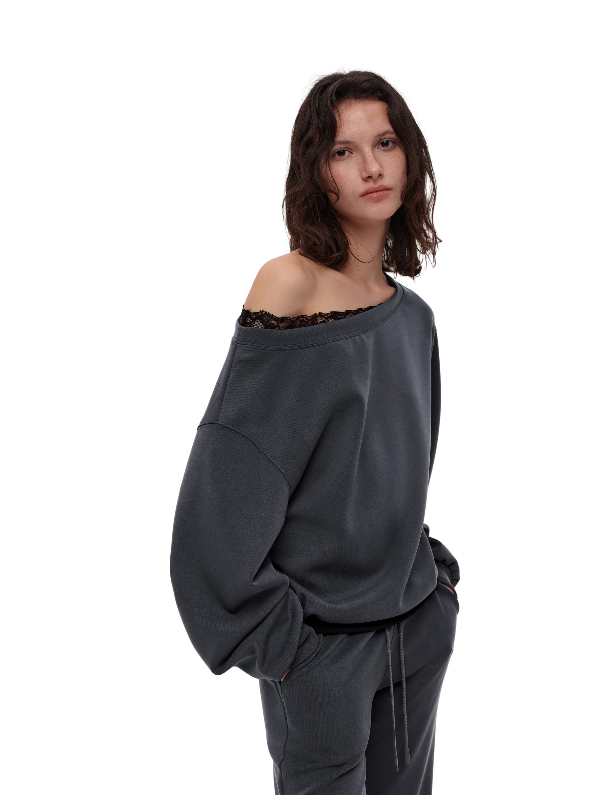 Oversized Hoodie Dress with a faux two-layer collar and subtle lace trim for a touch of contrast. The layered hem adds texture and detail. Made of lightweight air-loop fabric for a drapey comfortable feel, with a soft brushed lining at the lower panel. Features a versatile boat neck that can be worn off-shoulder or straight for stylish multi-way styling.