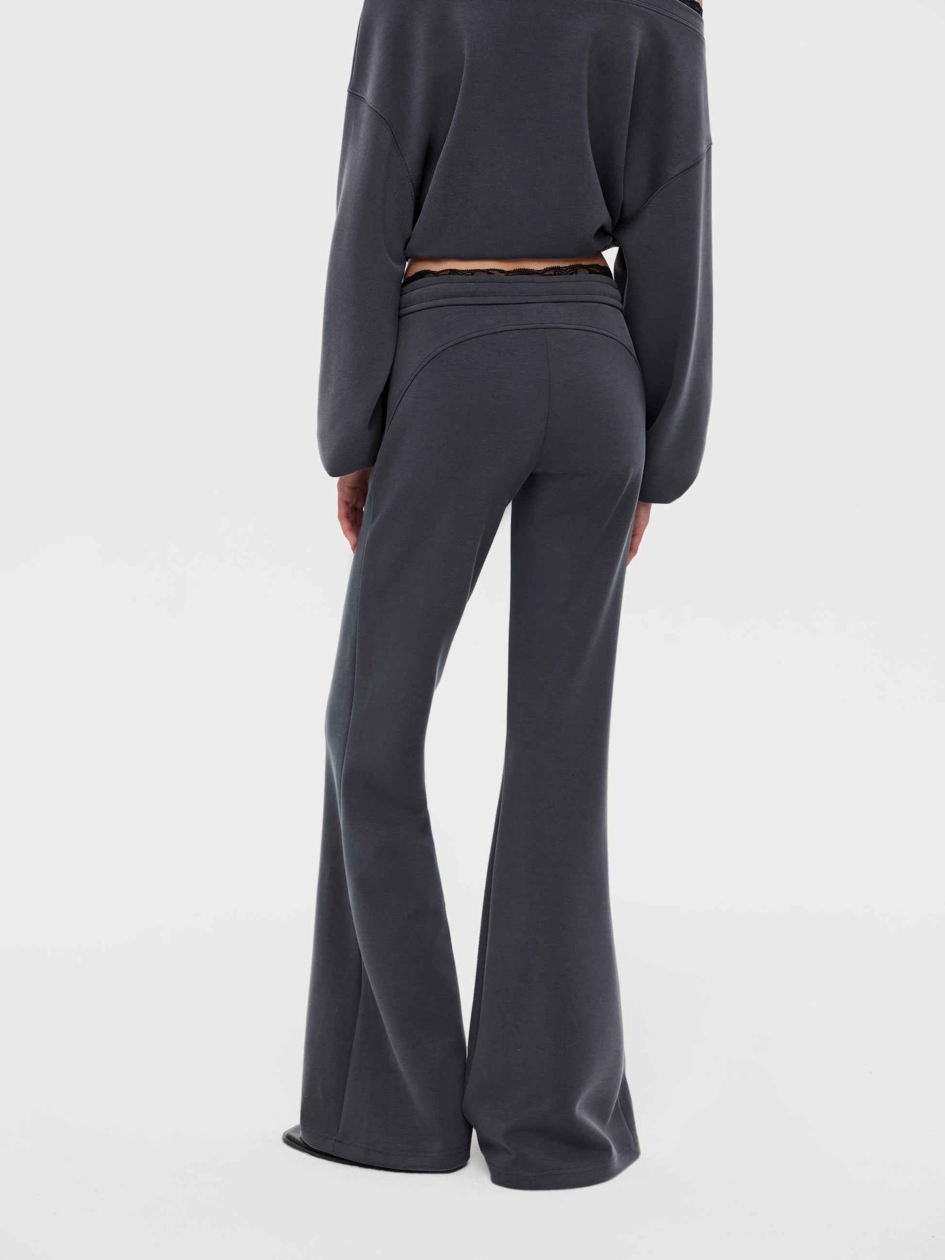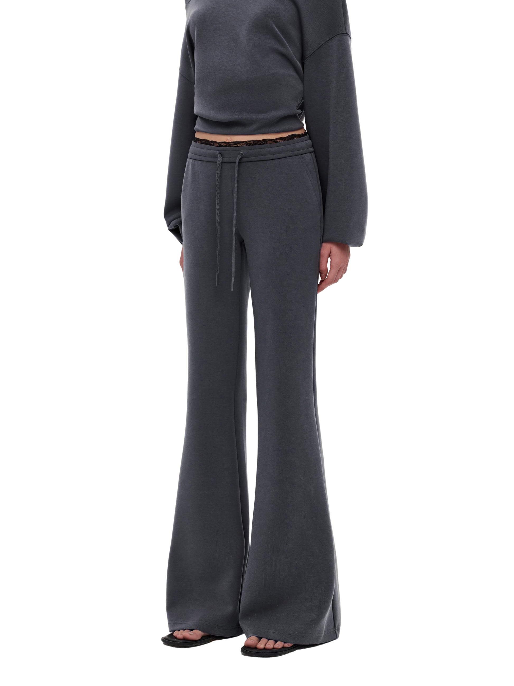 Flared Sport Pants with a faux layered waistband and delicate contrast lace trim for added detail. Features an elastic drawstring waist for easy wear and a curved back panel that contours and flatters your silhouette.