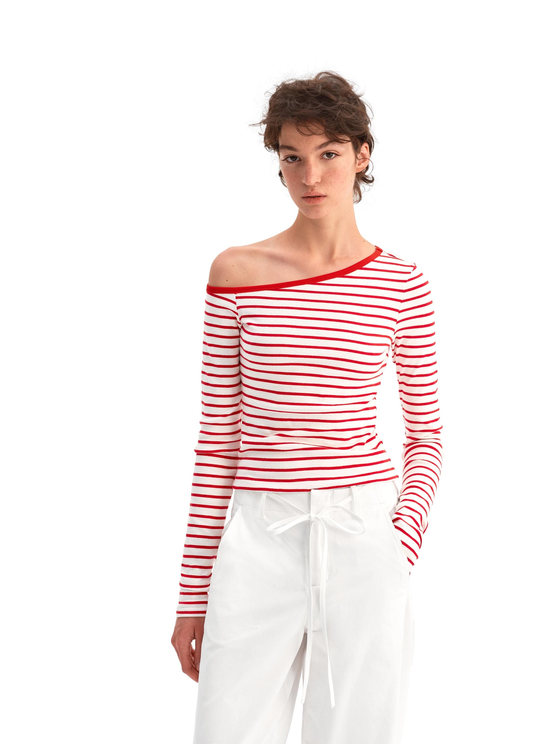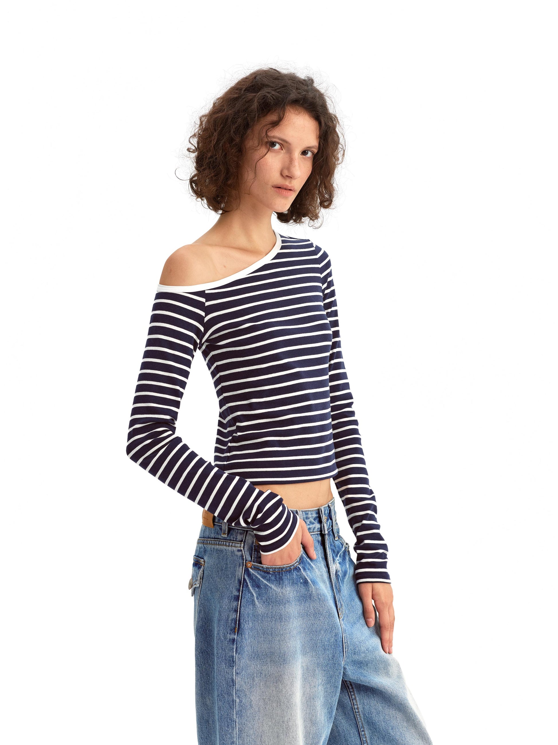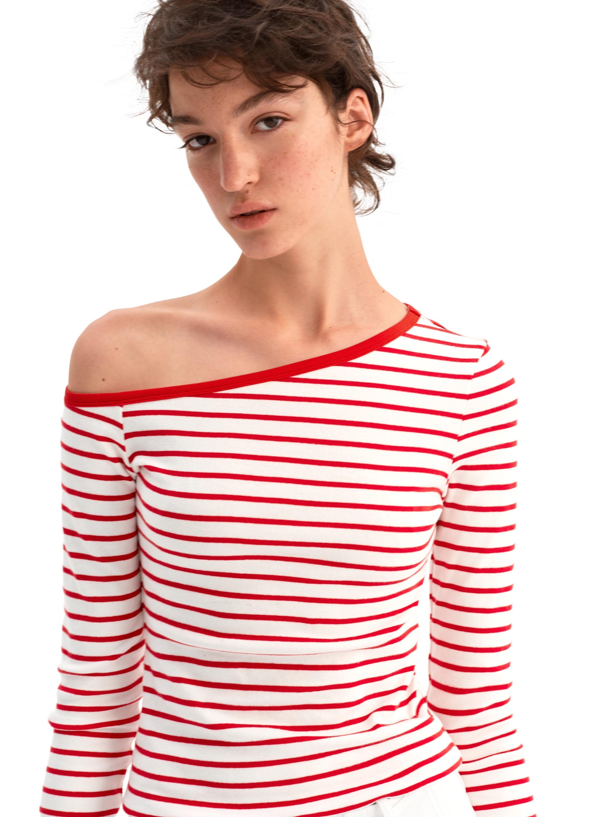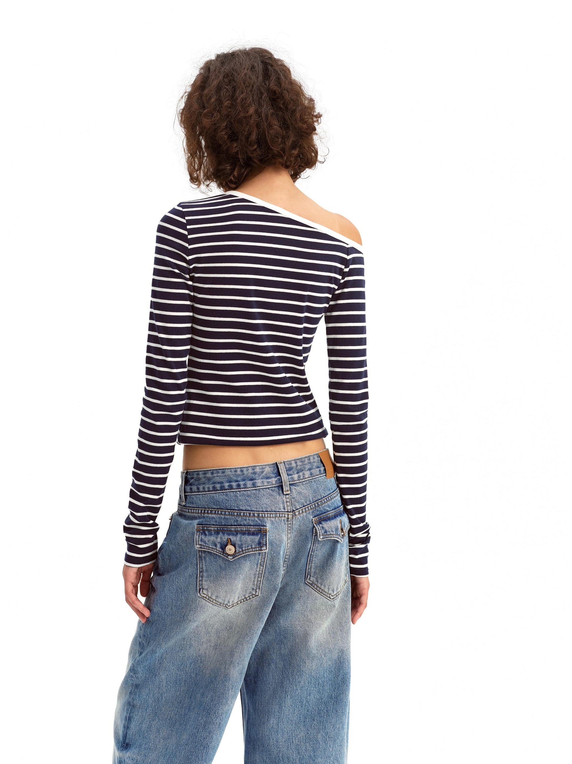 Slim Cropped Top with a waist-defining fit that elongates your silhouette. Features retro stripes for a versatile, timeless look. The off-shoulder neckline reveals your collarbone and shoulder for a delicate yet bold appeal. Contrast trim along the neckline adds a vibrant, expressive touch — perfect for making a retro-modern statement.