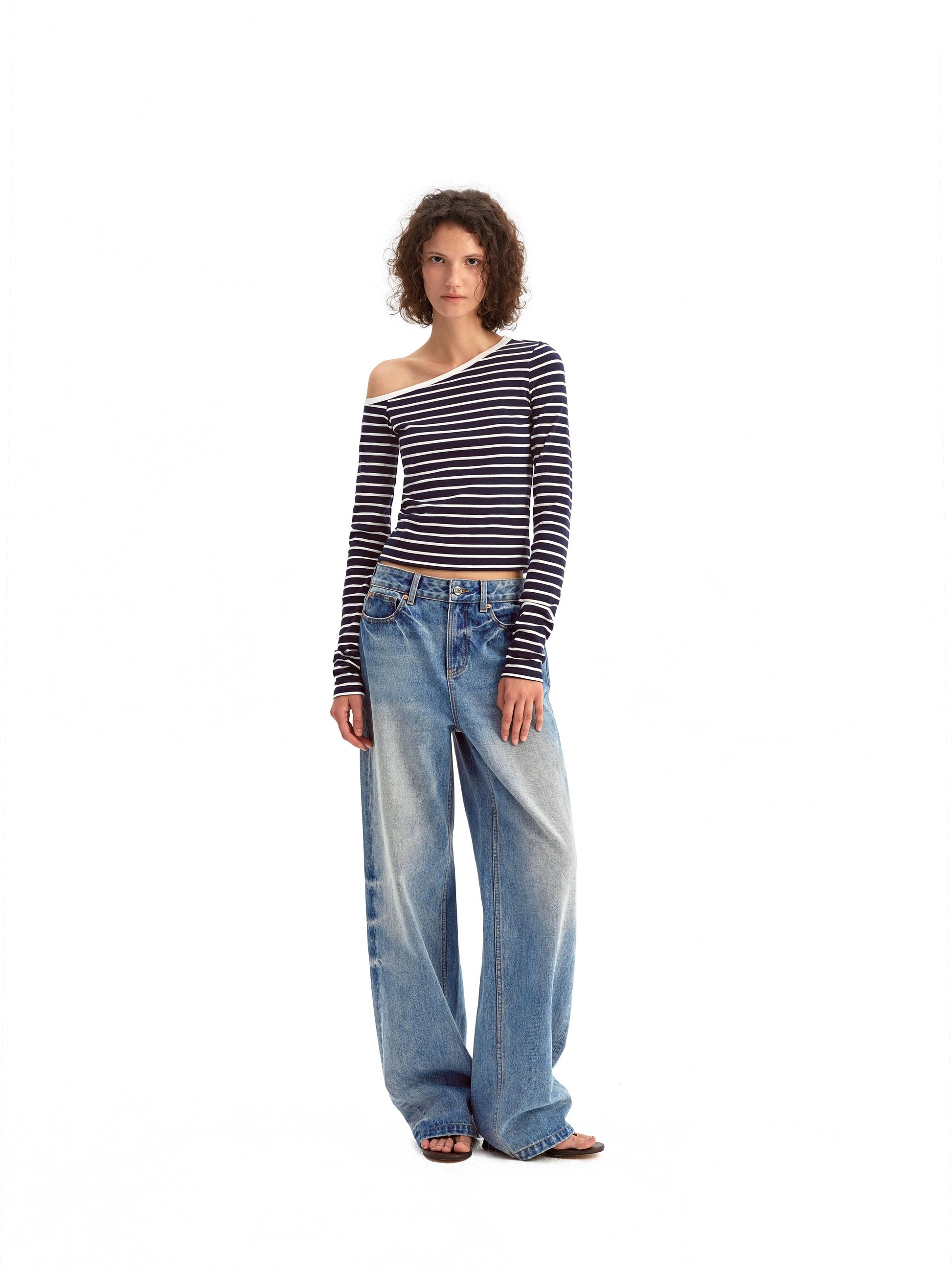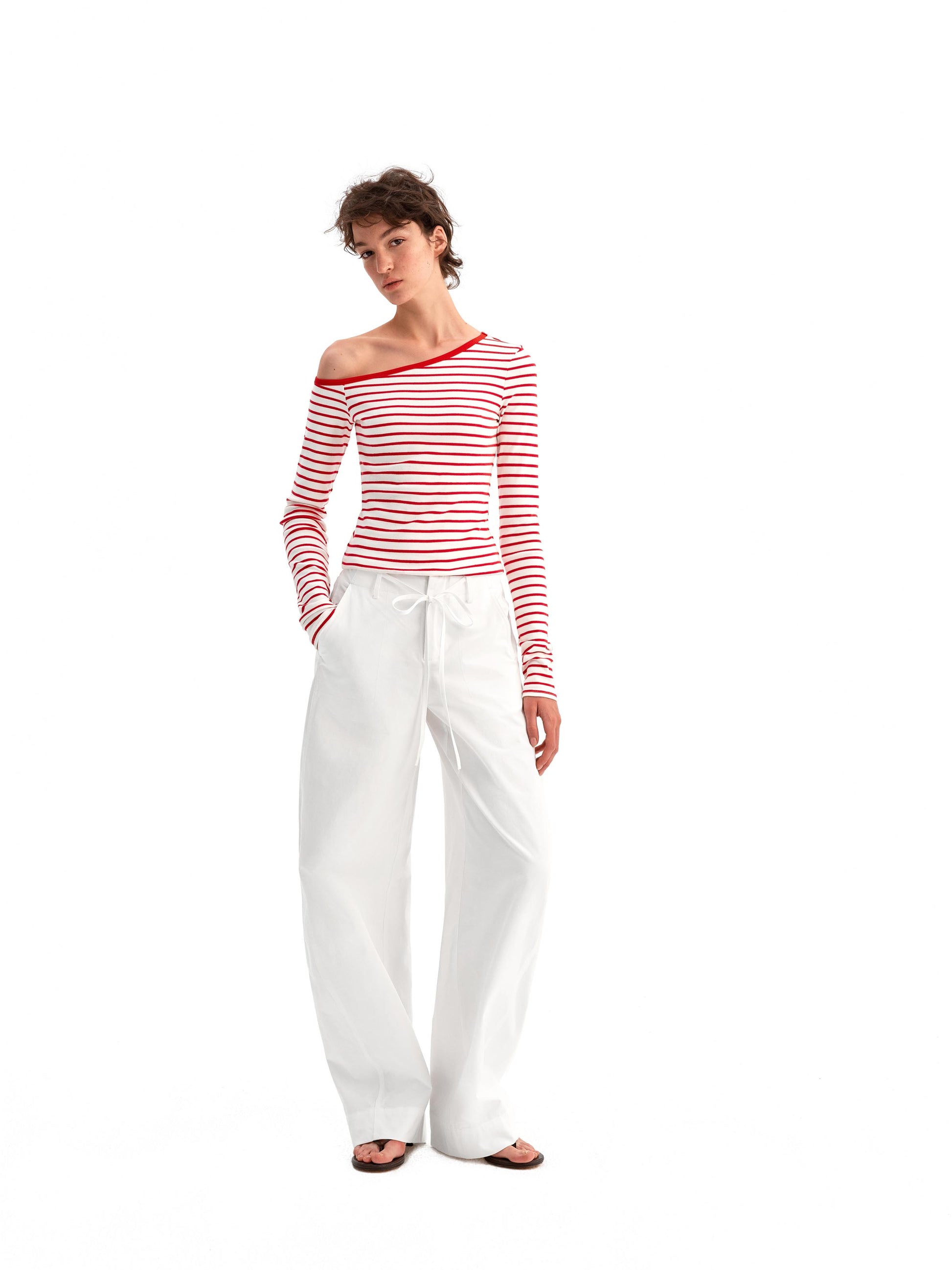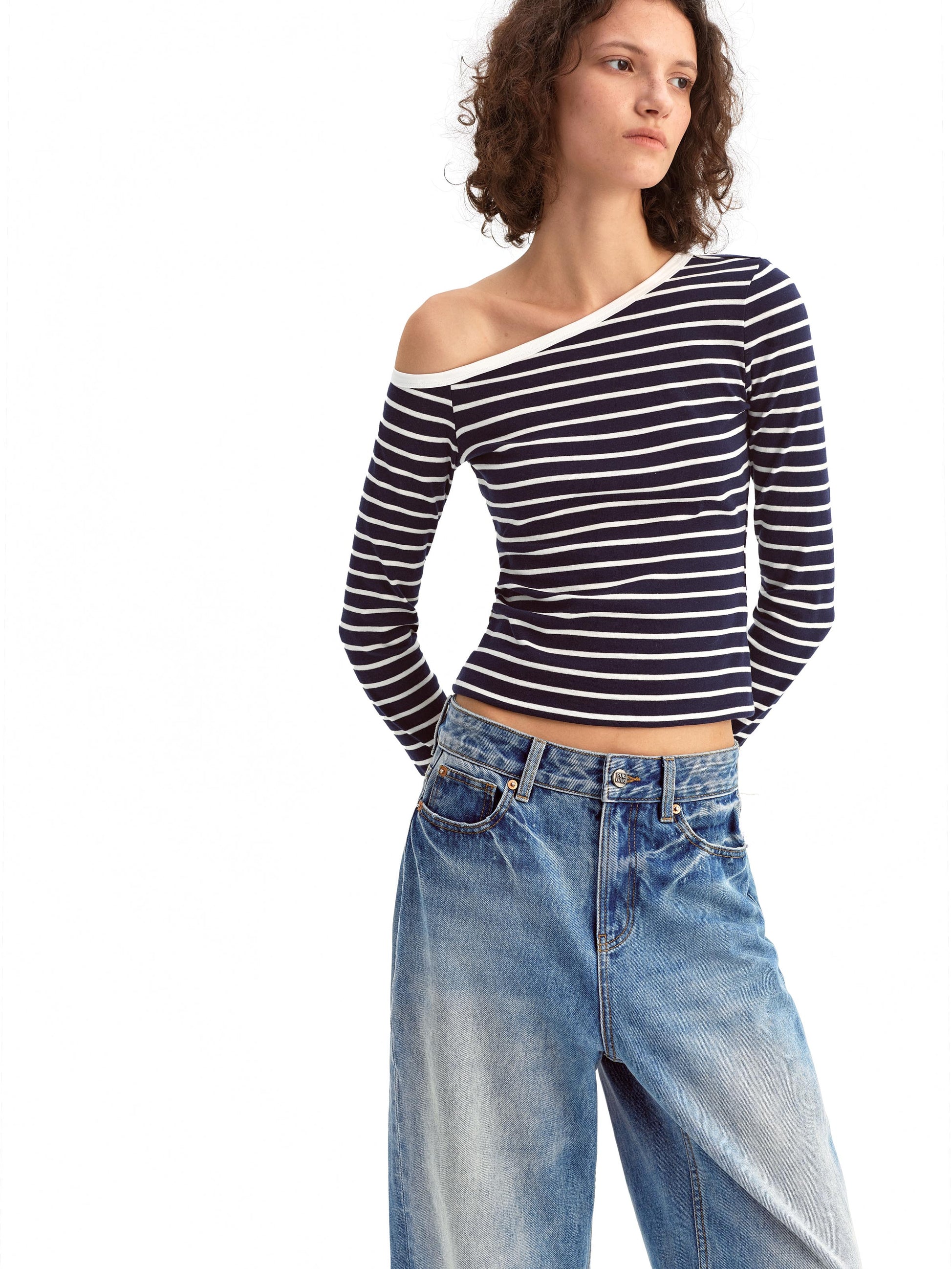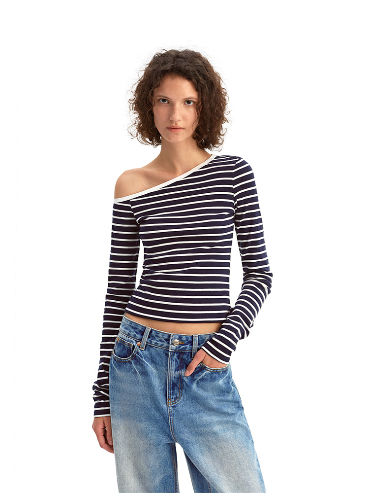 Slim Cropped Top with a waist-defining fit that elongates your silhouette. Features retro stripes for a versatile, timeless look. The off-shoulder neckline reveals your collarbone and shoulder for a delicate yet bold appeal. Contrast trim along the neckline adds a vibrant, expressive touch — perfect for making a retro-modern statement.