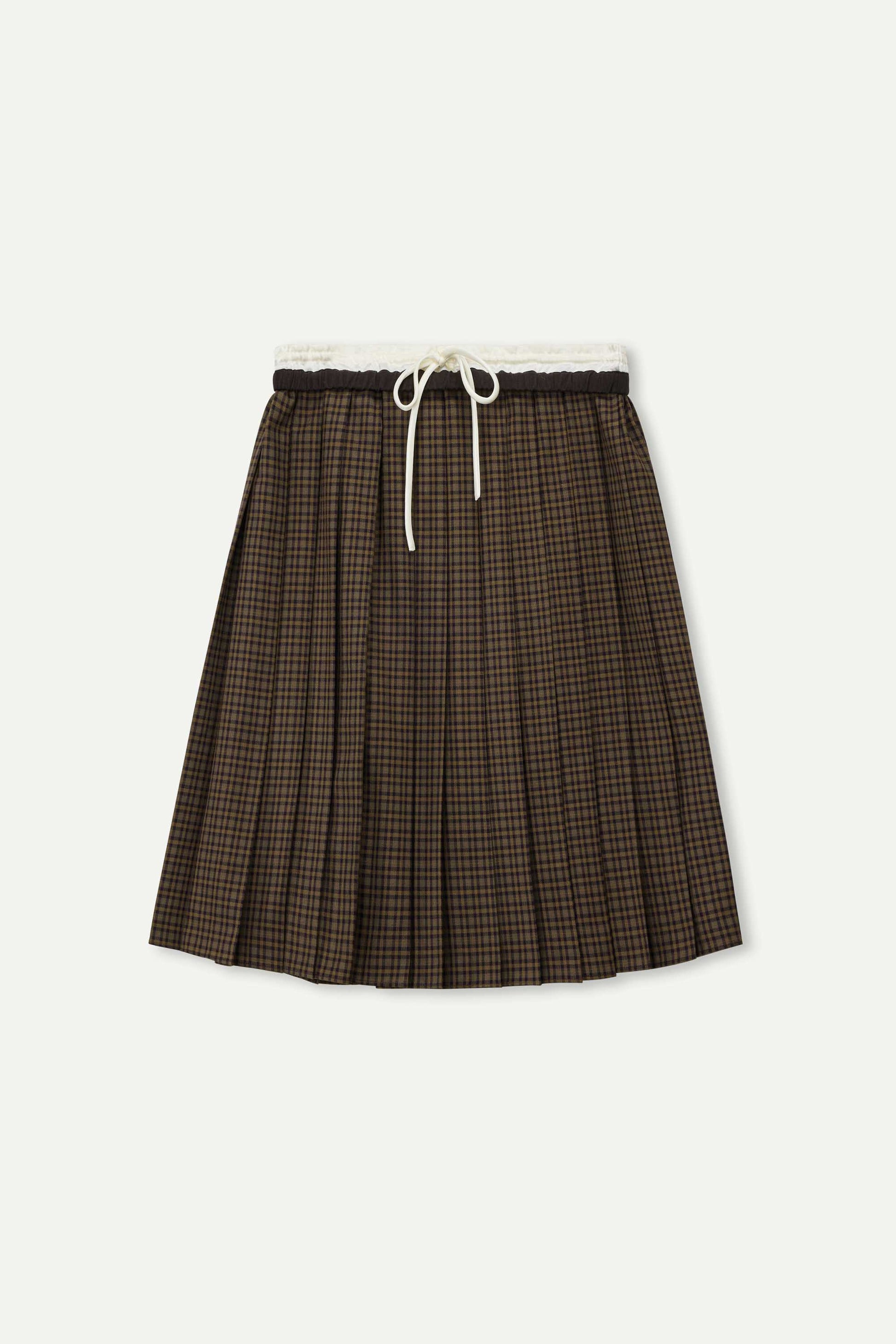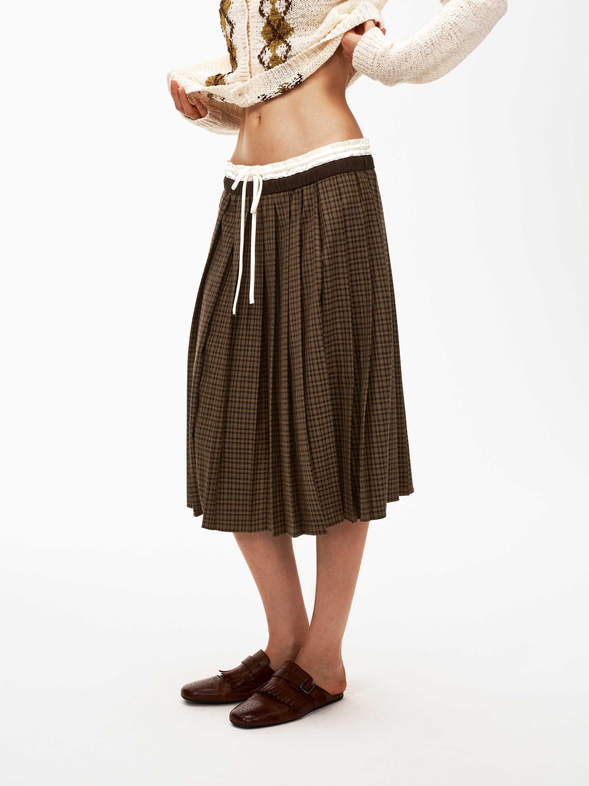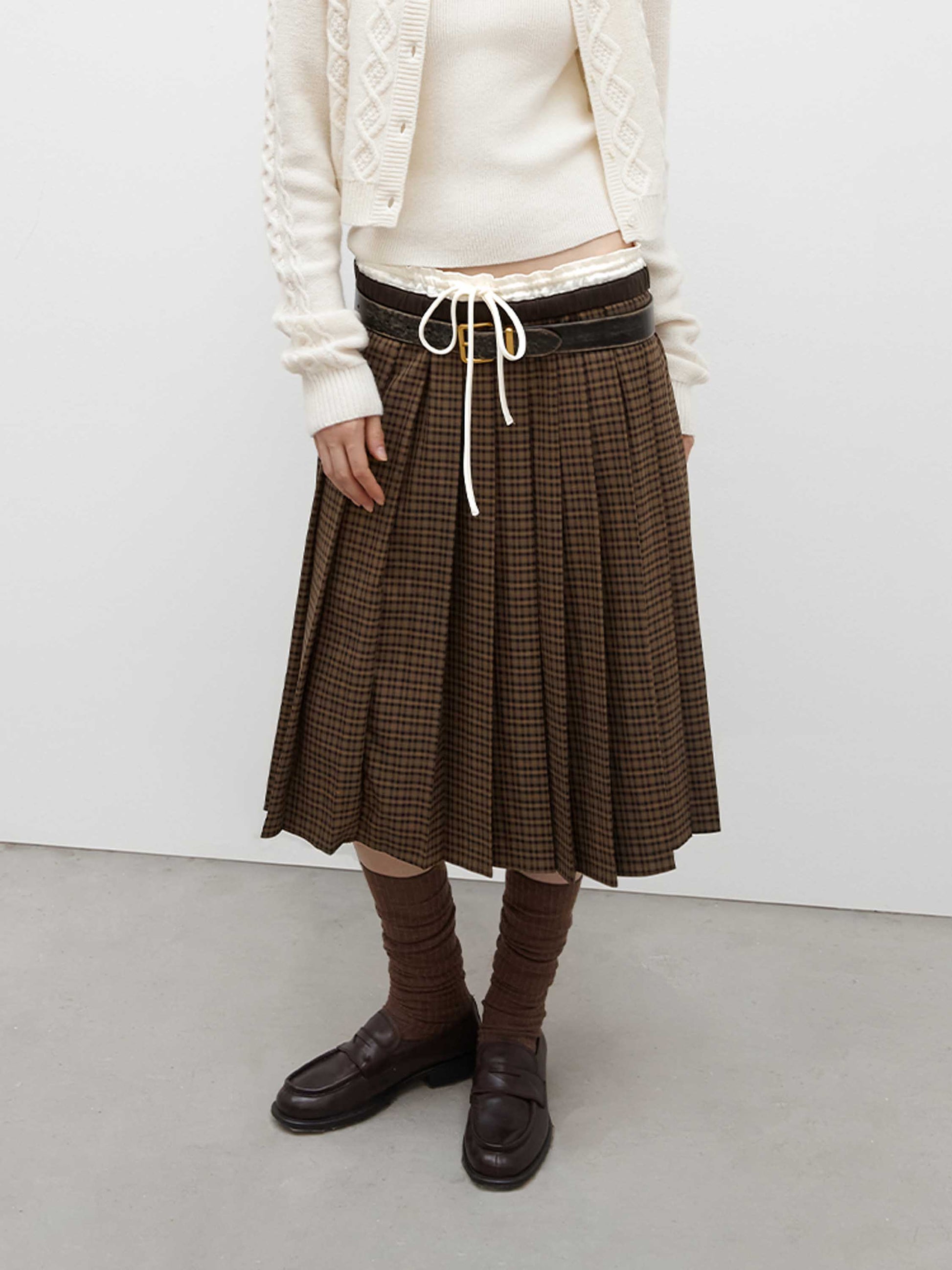 Quiet details: A classic plaid pleated skirt featuring a double contrast waistband for a modern layered touch. The structured pleats are neatly pressed to elongate the legs, creating a refined and versatile look perfect for fall and winter styling.