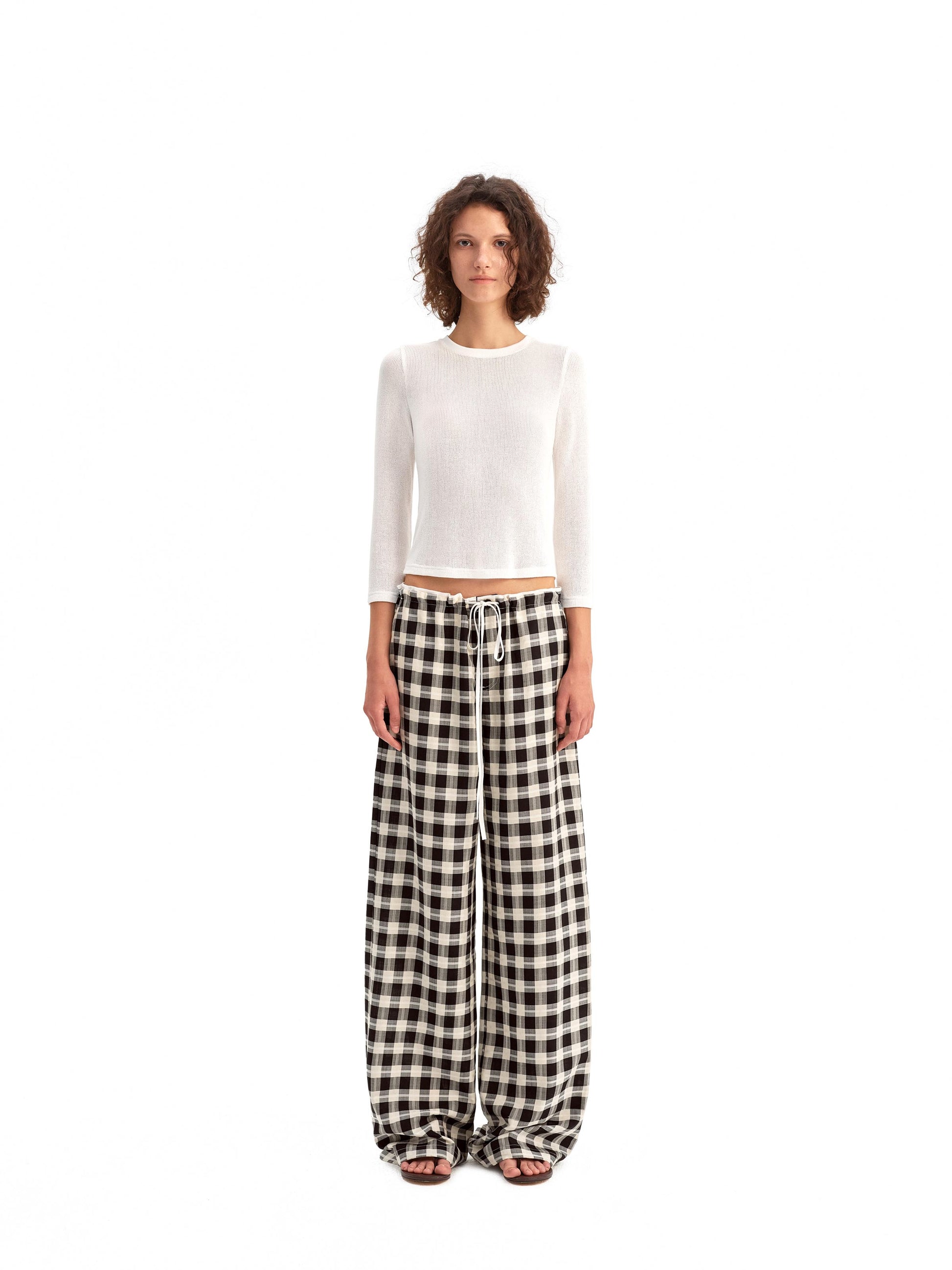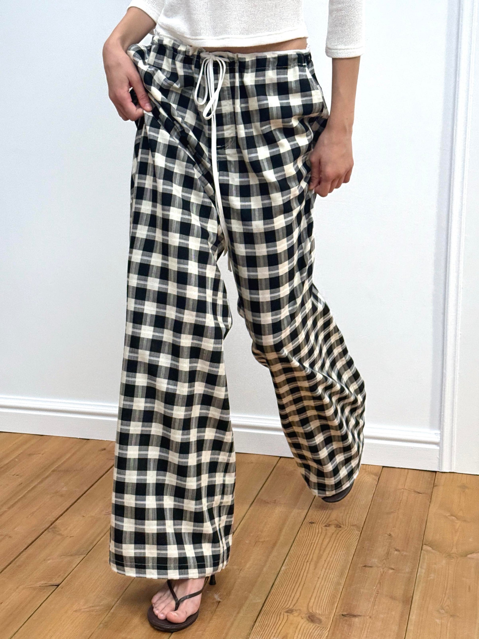 - Vintage Wide-Leg Checkered Pants with a relaxed, effortless drape. The contrast white waistband and adjustable drawstring offer both style and easy wear. Designed in a mid-low rise for a laid-back fit, the bold checkered pattern adds visual depth and modern retro flair.