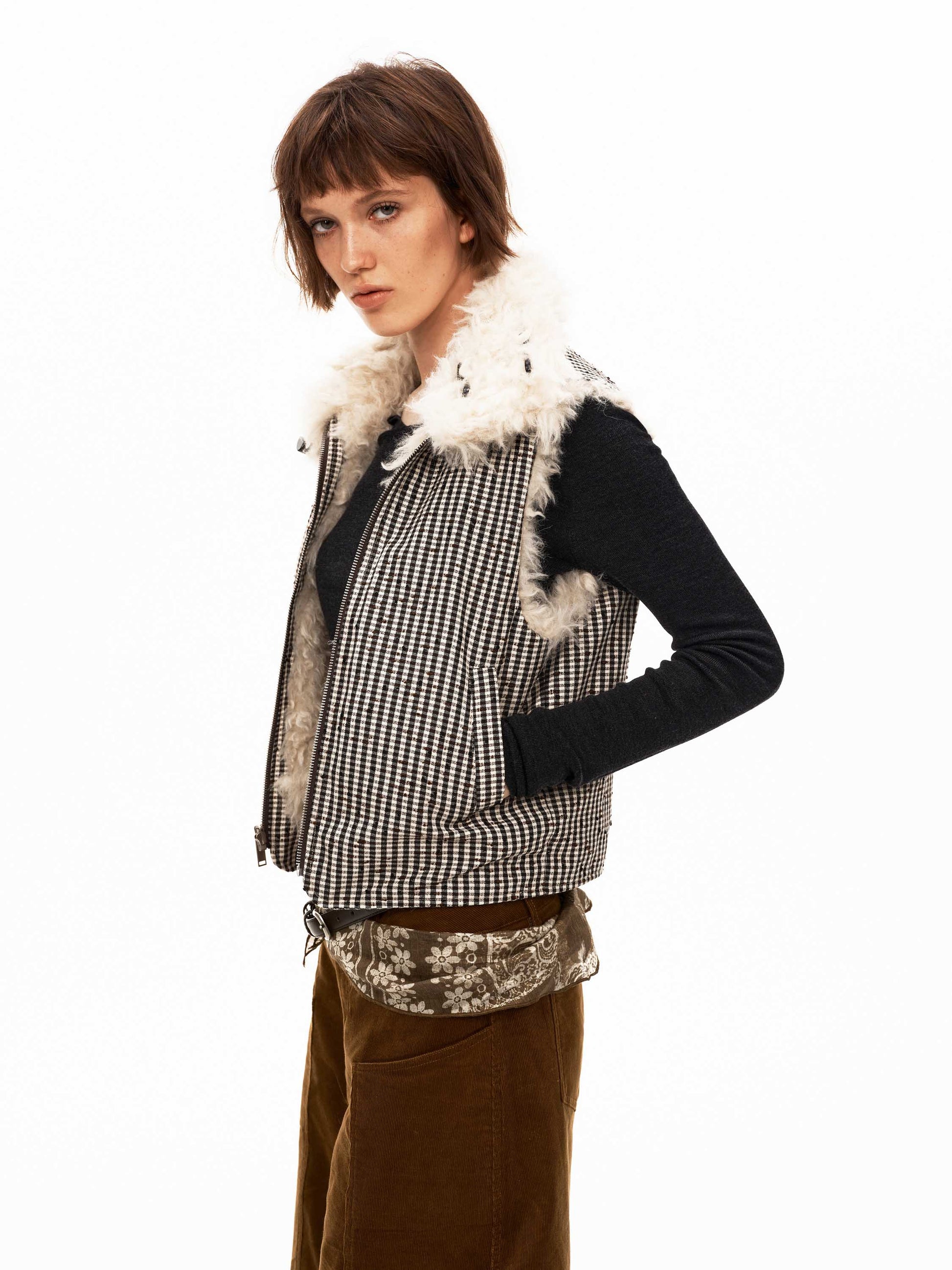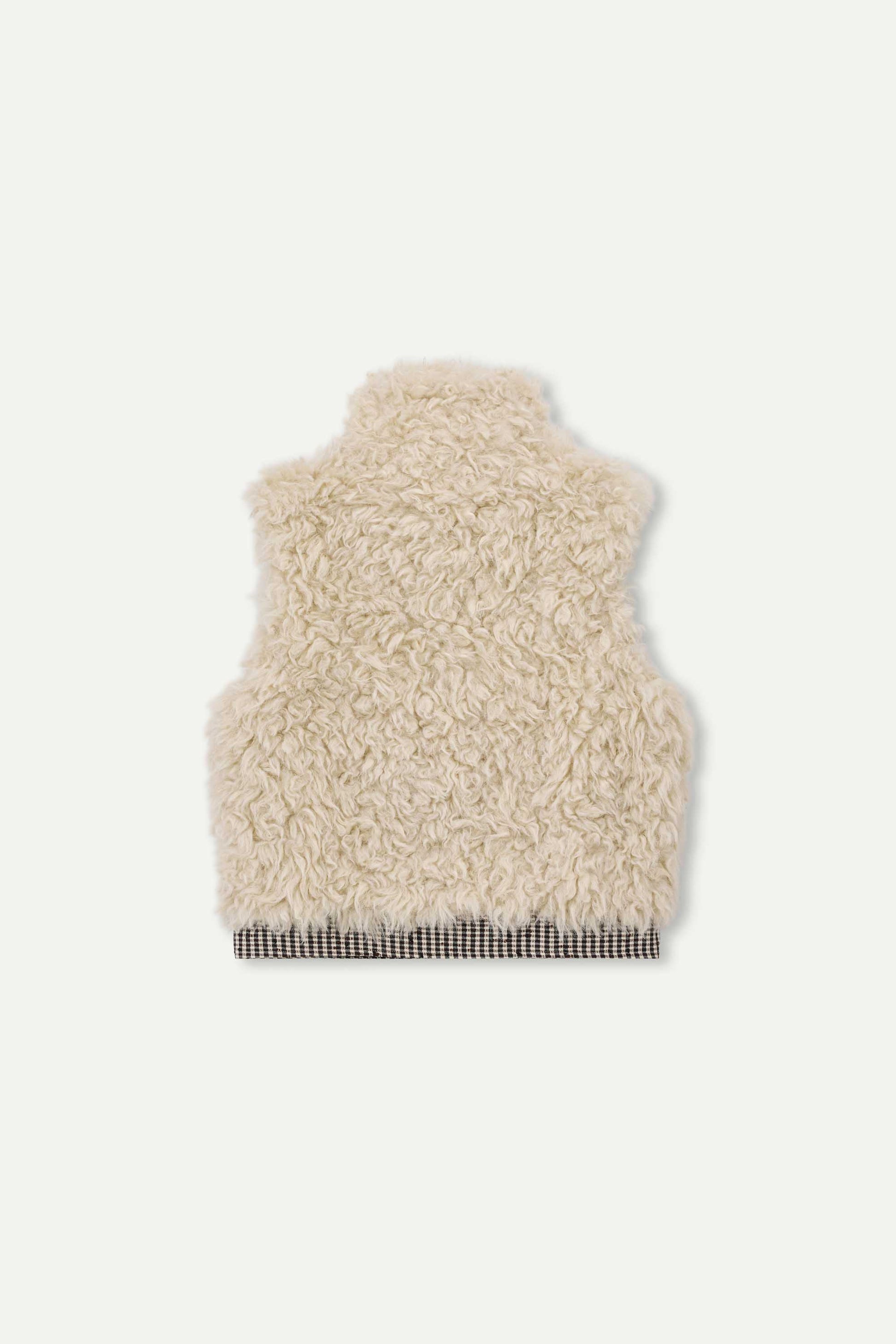 Quiet details:A cozy reversible vest featuring a classic check fabric on one side and soft faux shearling on the other. The high collar with toggle detail adds warmth and playfulness, while the dual-sided design offers styling versatility for casual or refined winter looks.
