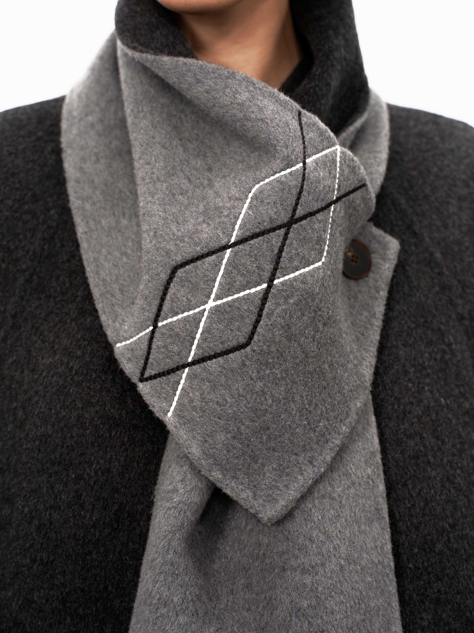 The detachable scarf is designed with a cape-like silhouette for dramatic yet wearable appeal.
