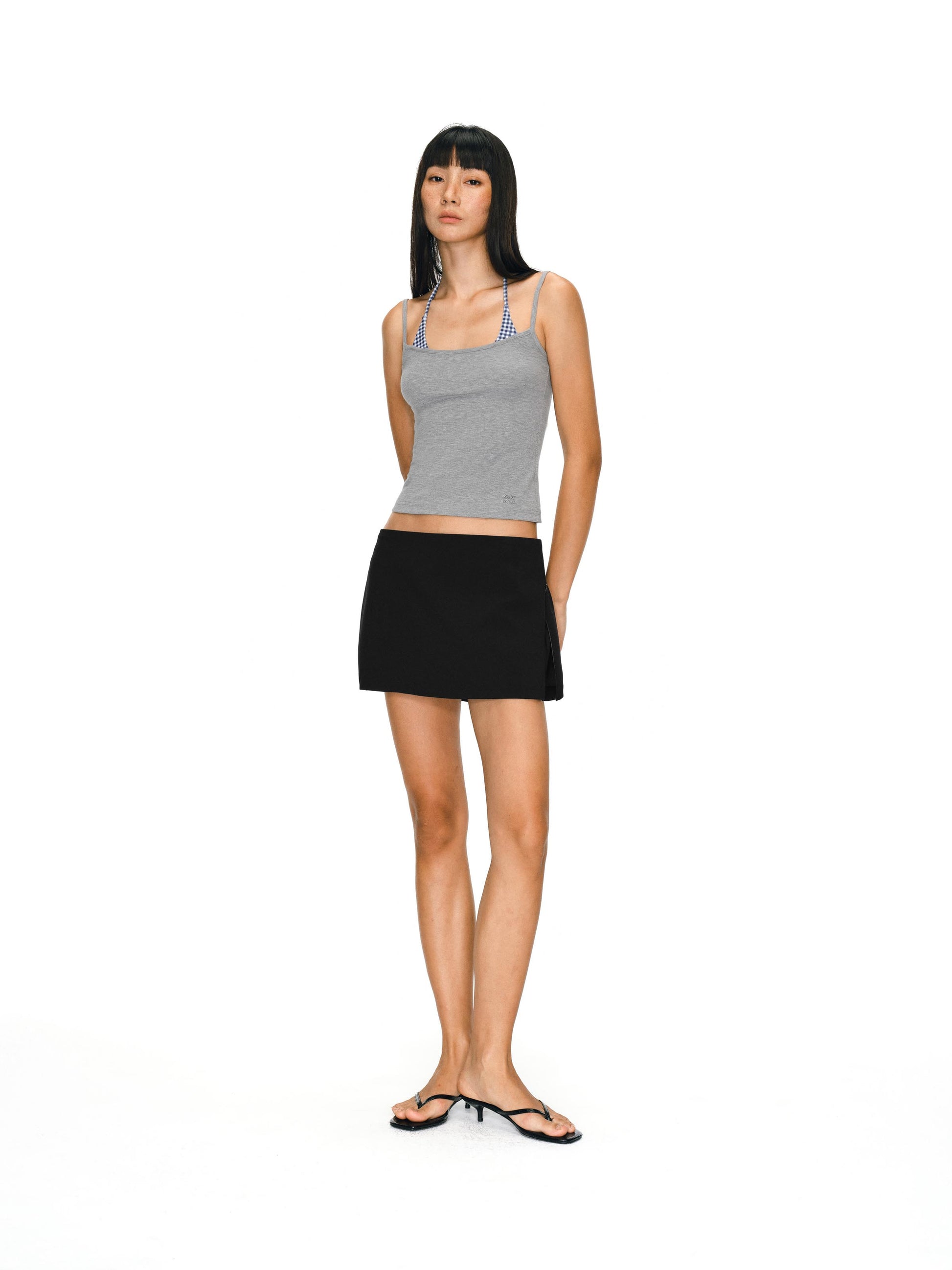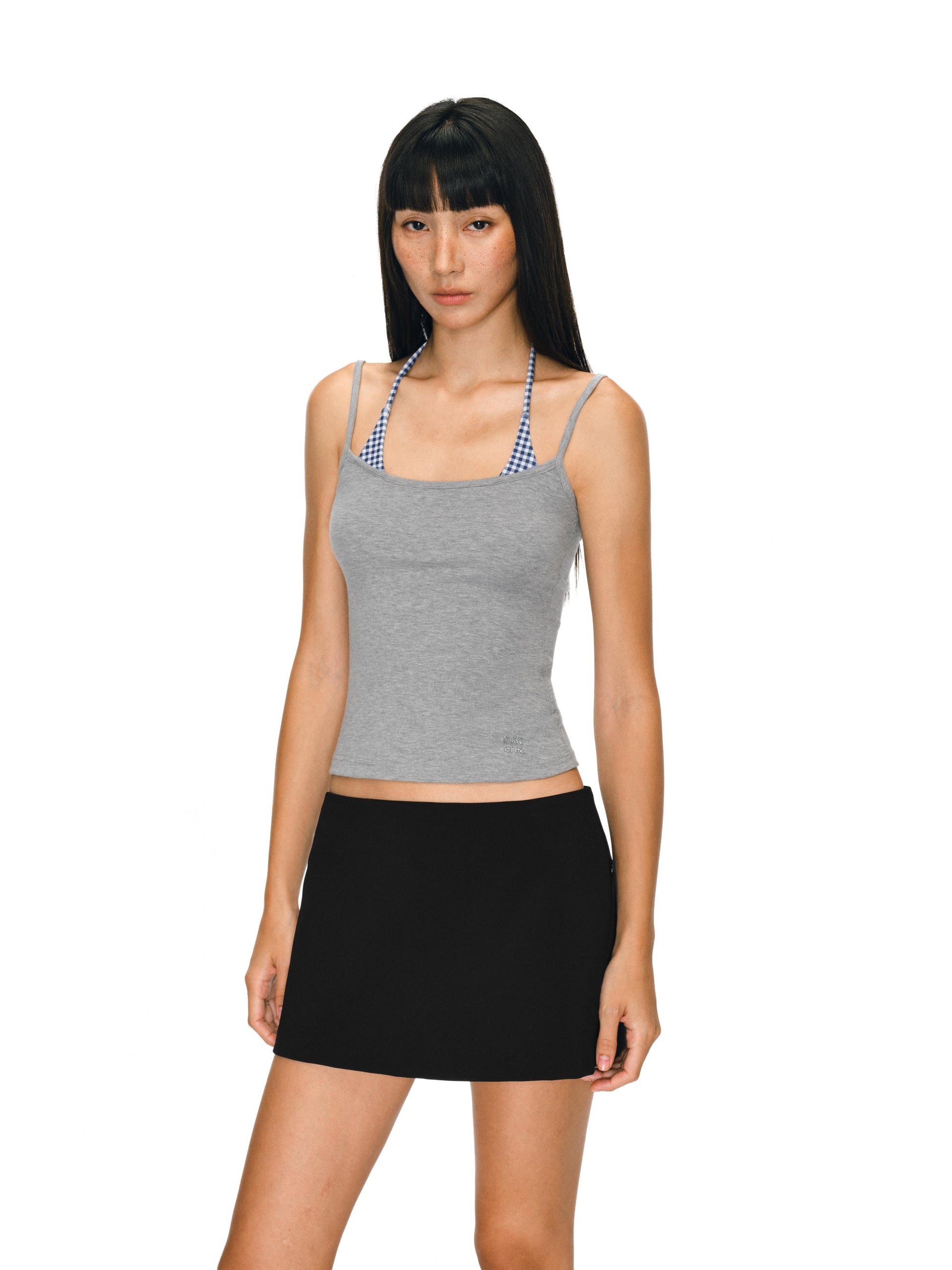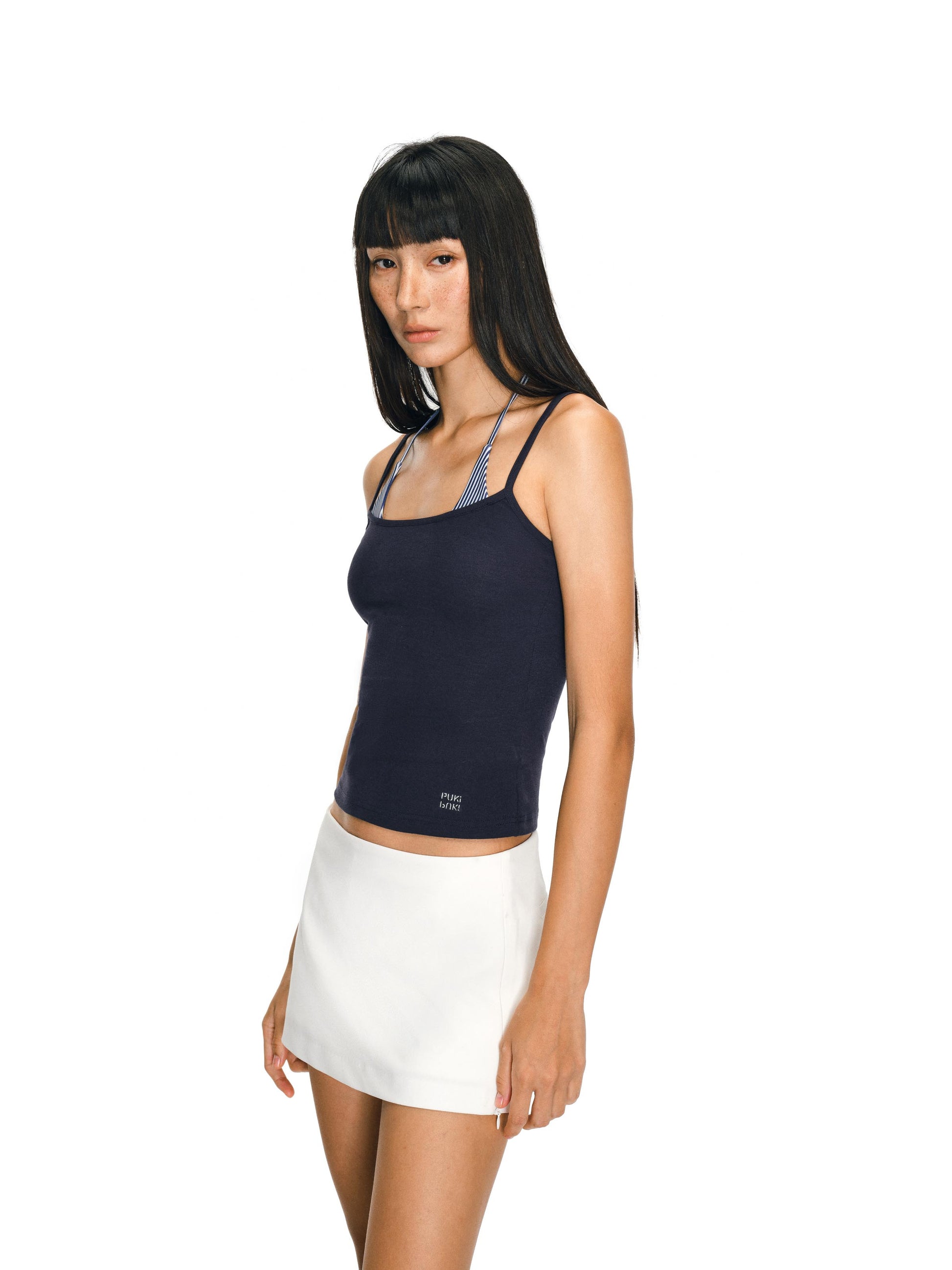 This faux-layer halter top features a bikini-inspired neckline and contrast patterns, giving it a perfect resort vibe for summer. The low saturation blue and gray, combined with navy stripes and grid panels, create a chic "underwear-as-outerwear" look. Enhanced with a shimmering brand logo using high-frequency heat transfer, it adds playful sophistication and effortless style. Ideal for staying cool and stylish with just one piece.
