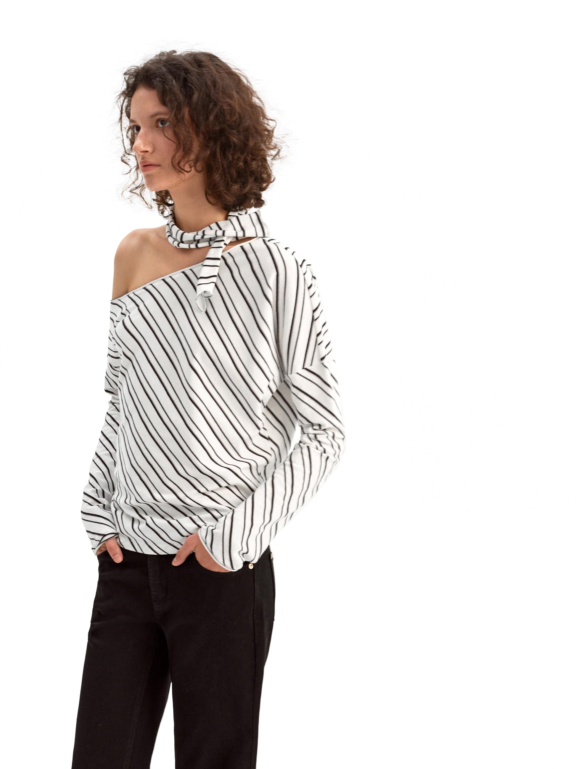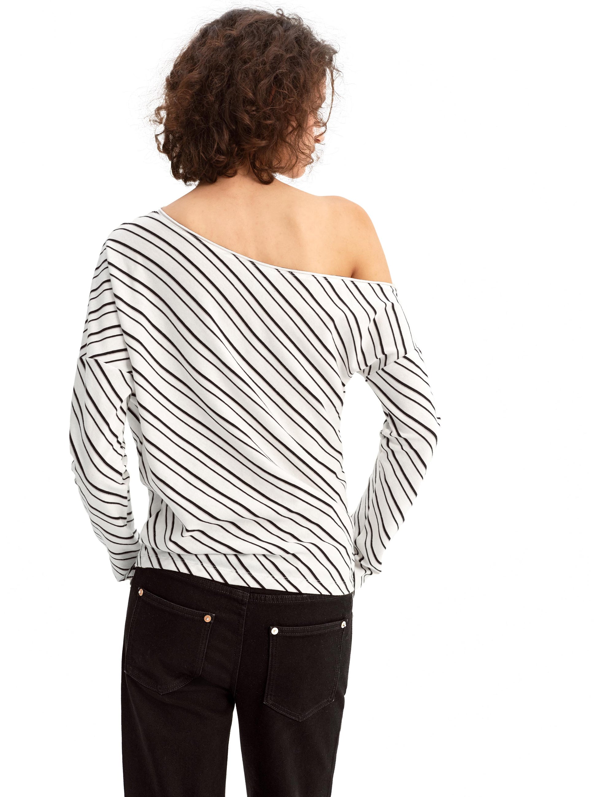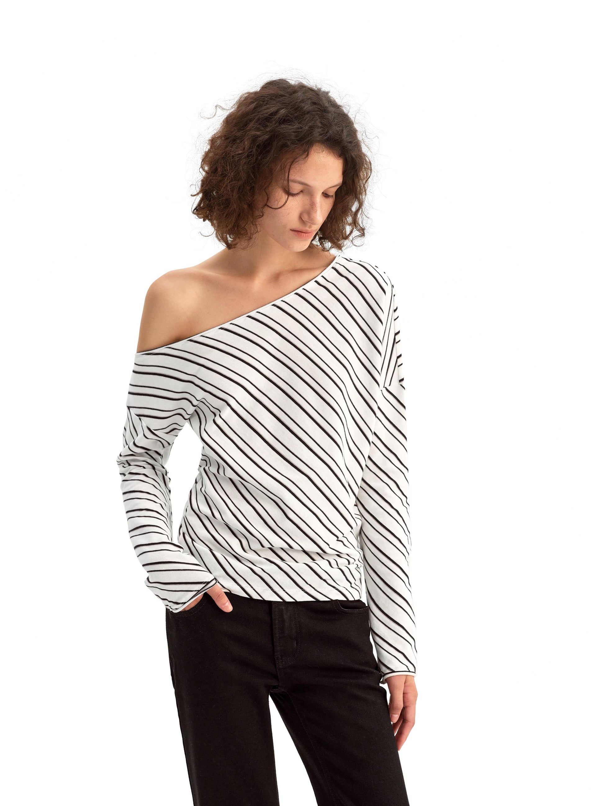 Relaxed Fit Top with a gently tapered hem for easy, laid-back style. The off-shoulder neckline reveals your collarbone and shoulder for a delicate yet chic look. Finished with rolled edges at the neckline and cuffs for cohesive texture and effortless detail. The curved hem creates soft gathers for a flattering and comfortable fit.