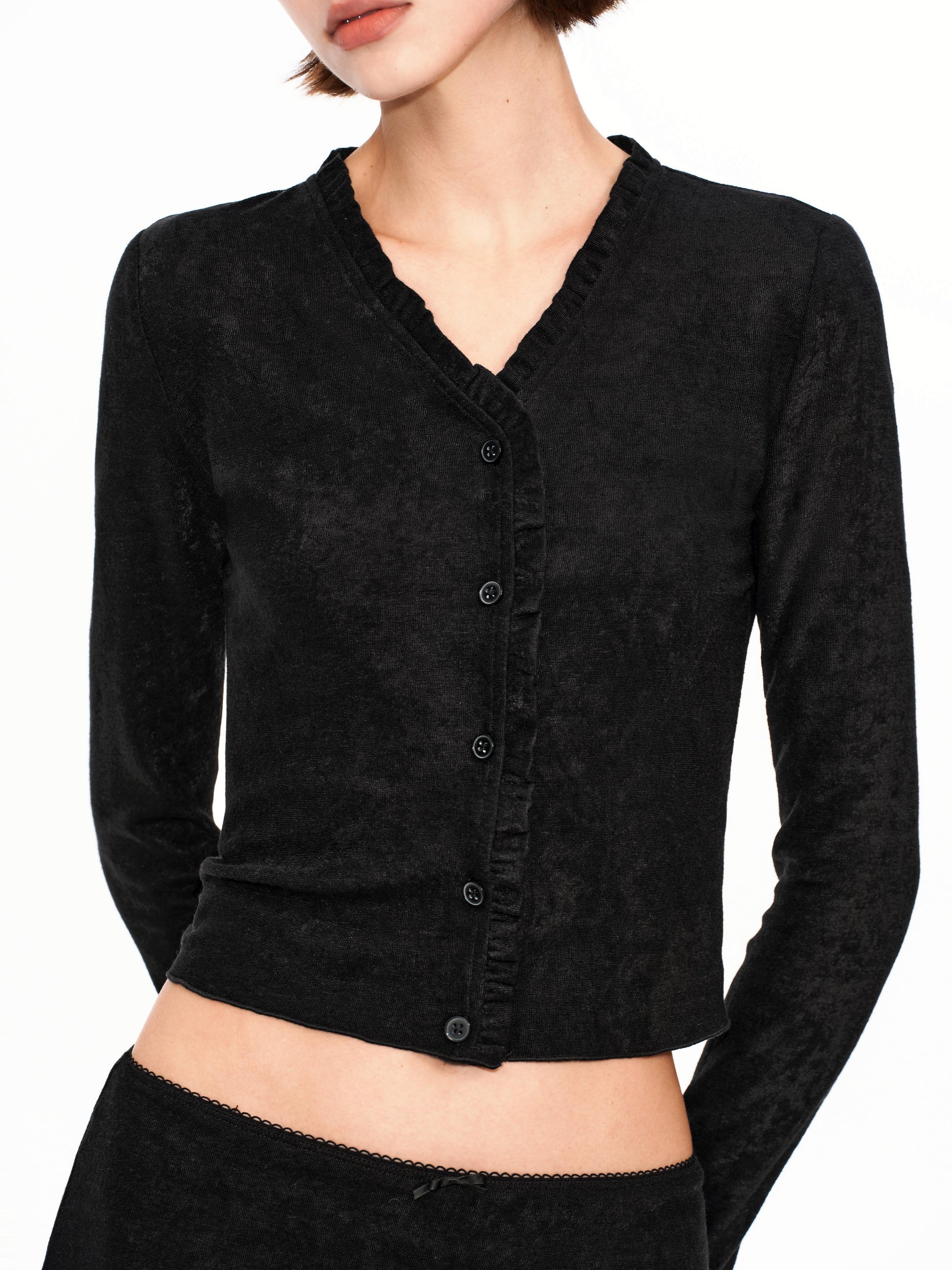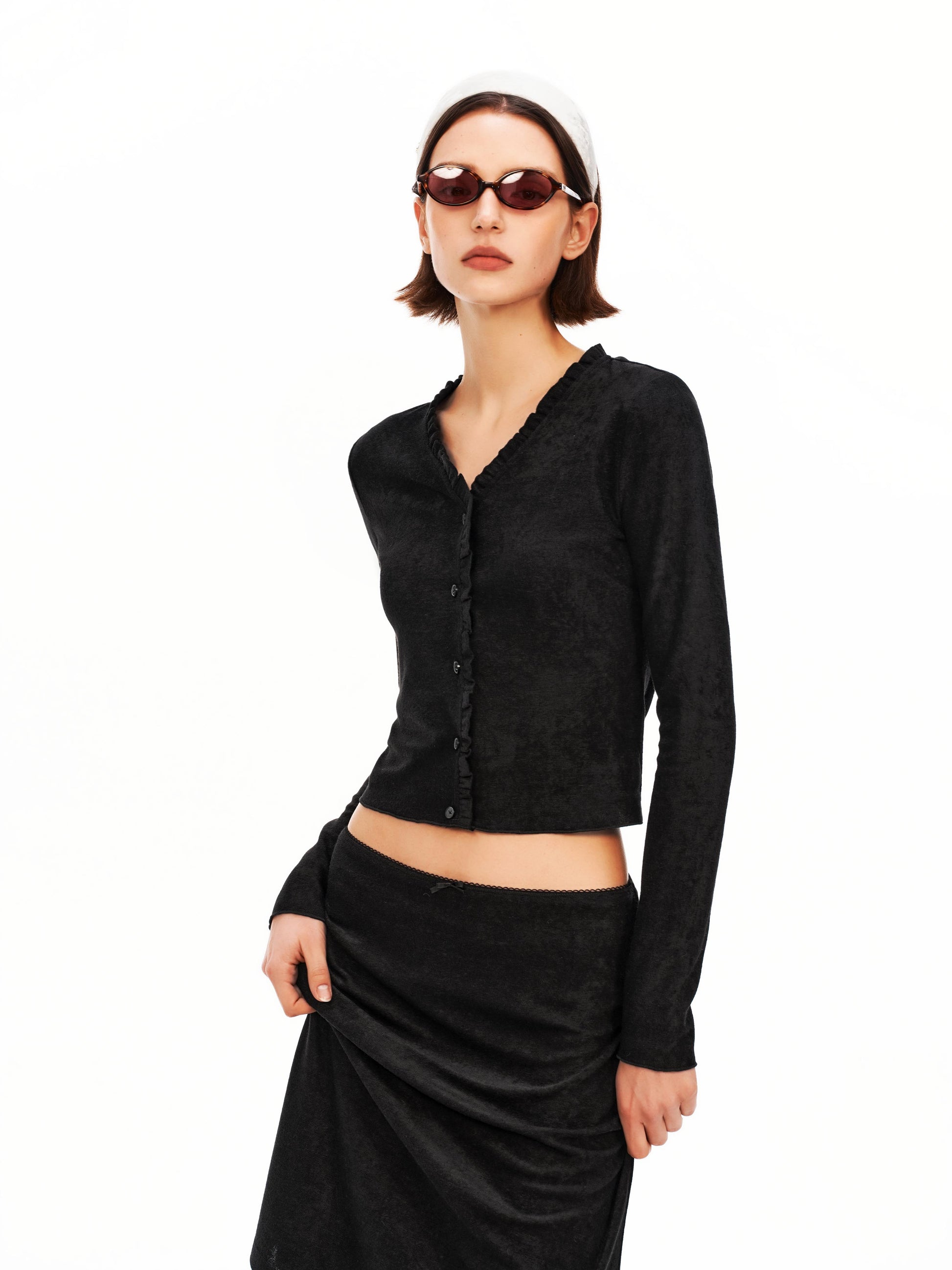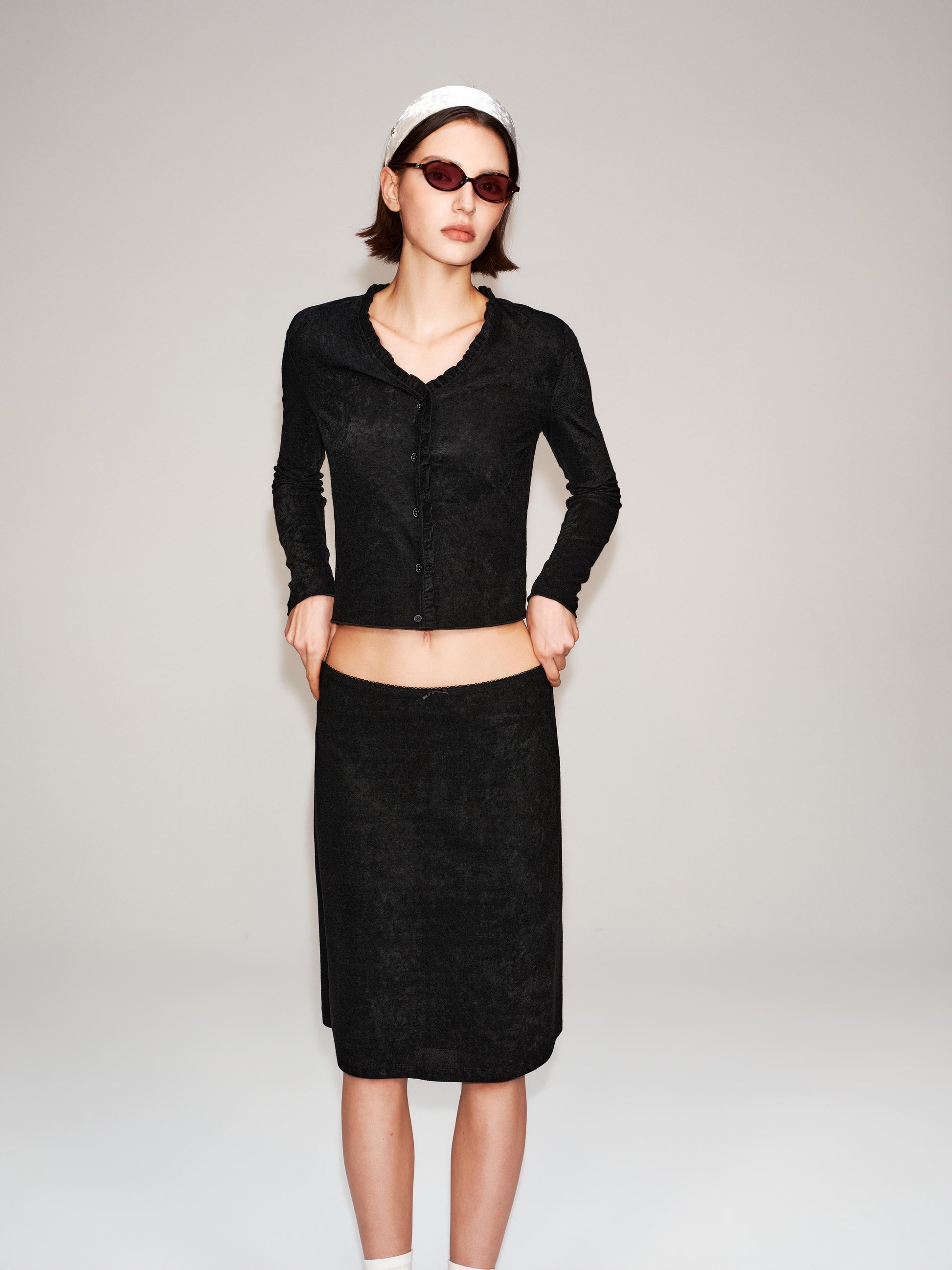 Quiet details: A textured knit twin set composed of a scalloped V-neck cardigan-style top and a bow-waist skirt. The top features a short, body-skimming cut with a clean buttoned front and delicate edging that traces the neckline, while the skirt is cut with a low-rise bow waistband and softly draped hem for a refined, feminine line.