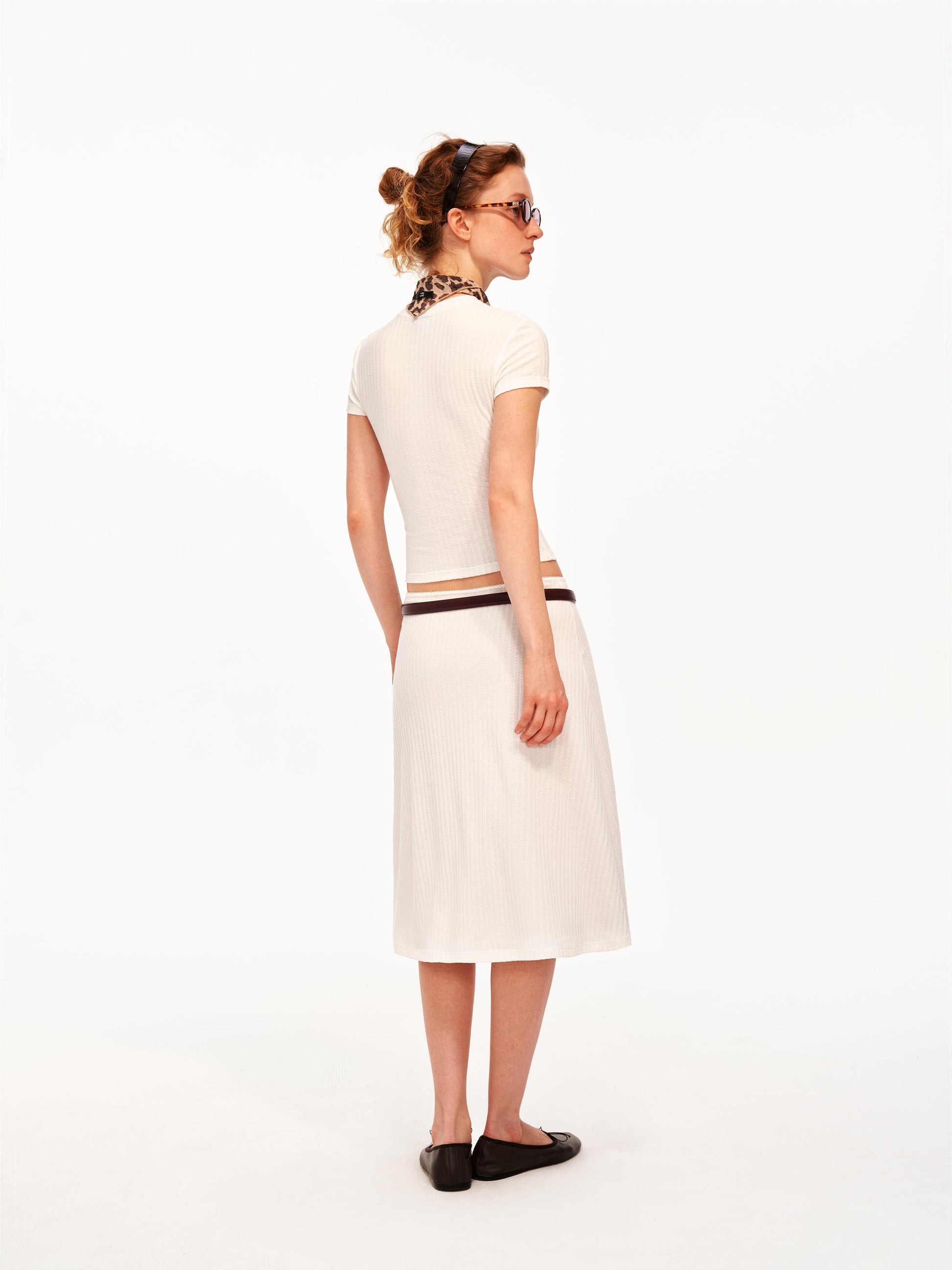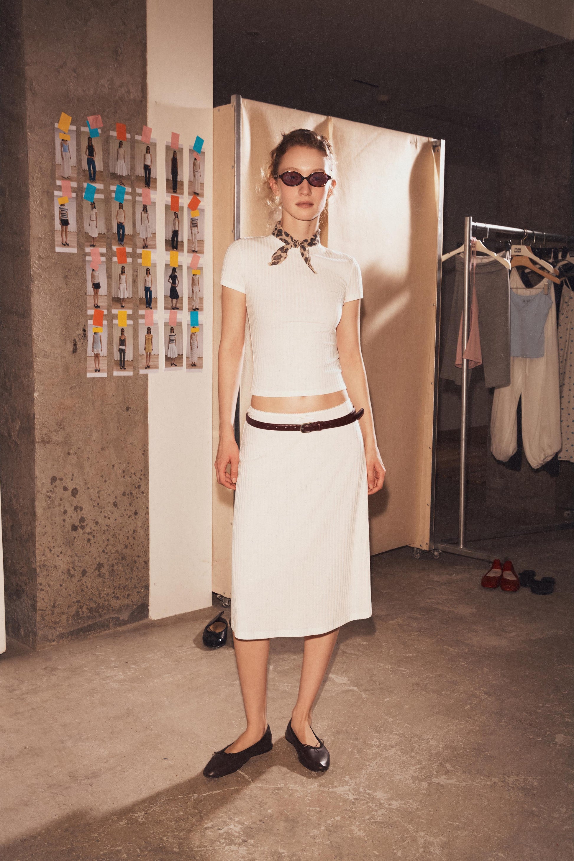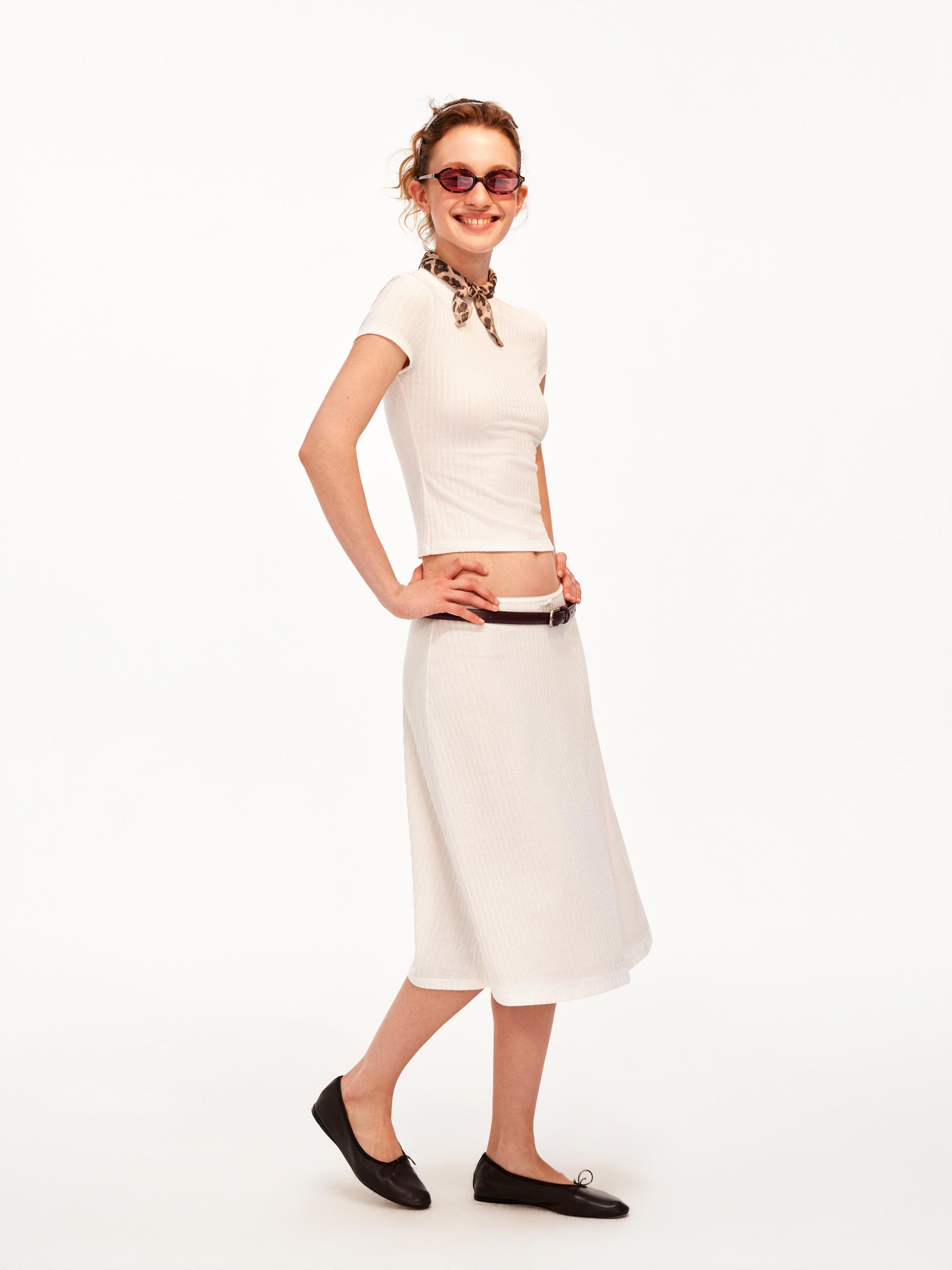 A lightweight textured rib knit with a soft, breathable feel and gentle stretch, designed to stay comfortable while maintaining a clean, structured shape. - Care: Machine wash cold on a gentle cycle. Wash inside out with similar colors. Do not bleach. Lay flat or hang to dry. Do not tumble dry. Cool iron if needed. Avoid high heat to preserve elasticity and texture.