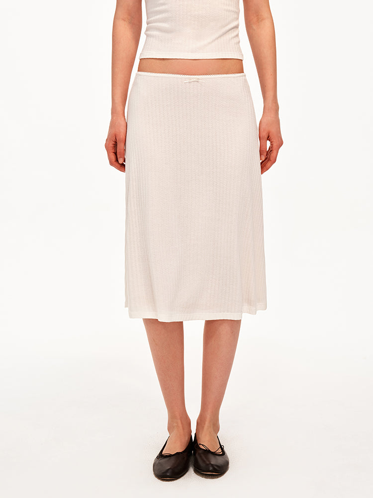 Quiet details: A relaxed two-piece set designed with a clean short-sleeve top and a softly structured A-line mini skirt. Crafted from a lightweight textured knit, the set balances a straight, easy silhouette with subtle feminine details — including a delicate ruffled waistband and a soft tie accent. Breathable, lightly sculpting, and easy to wear, it captures a quiet summer ease with a refined, modern finish.