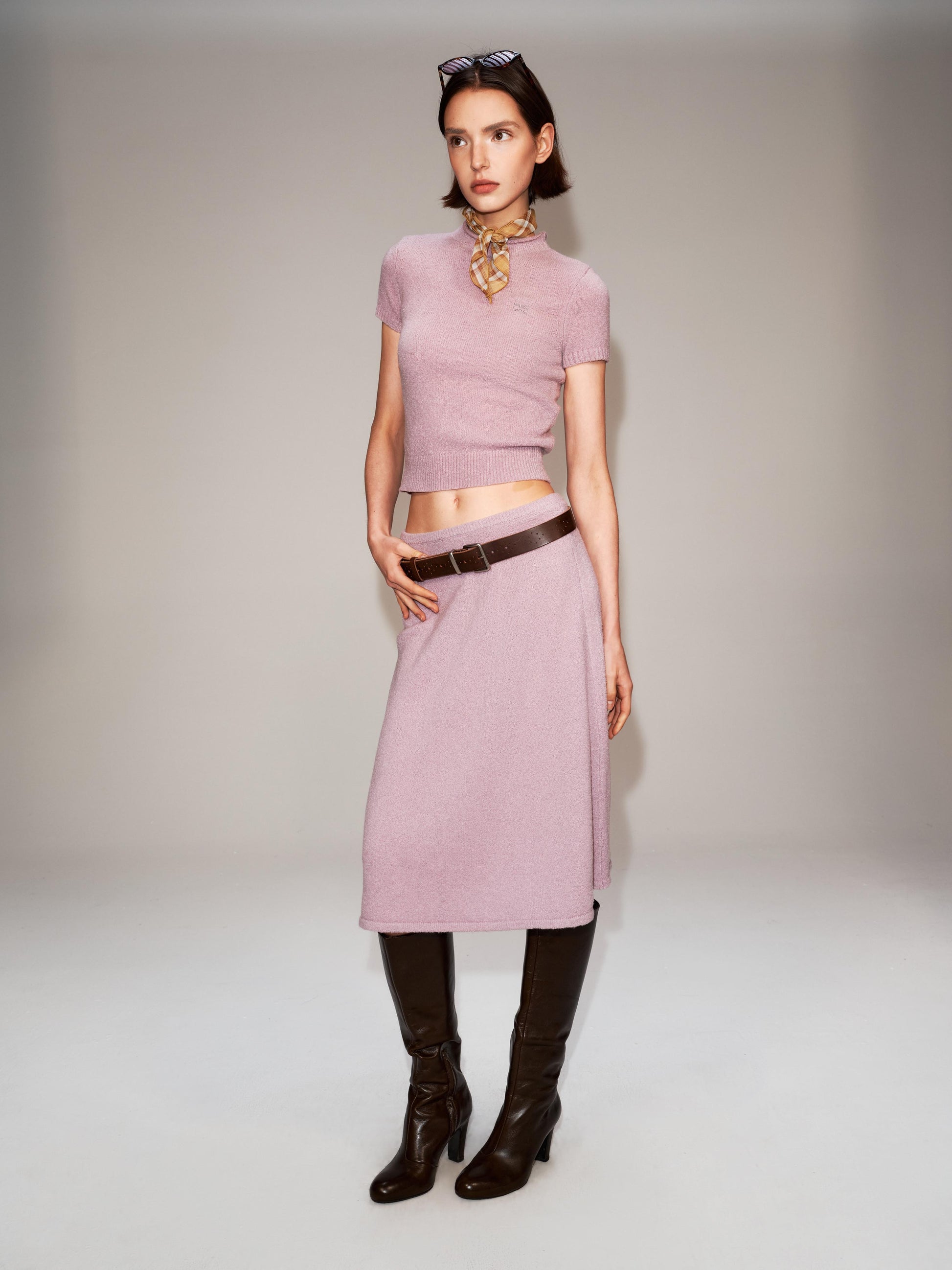 Quiet details: A softly structured wool-blend twin set featuring a cropped mock-neck top with rolled edges and a clean A-line skirt. The top offers a relaxed straight-body fit with lightly sculpted shoulders for an elongated upper line, while the boucle-style textured yarn enhances depth and tactility. The skirt’s elastic waist provides comfort and ease, forming a refined silhouette with a quiet yet elevated finish.