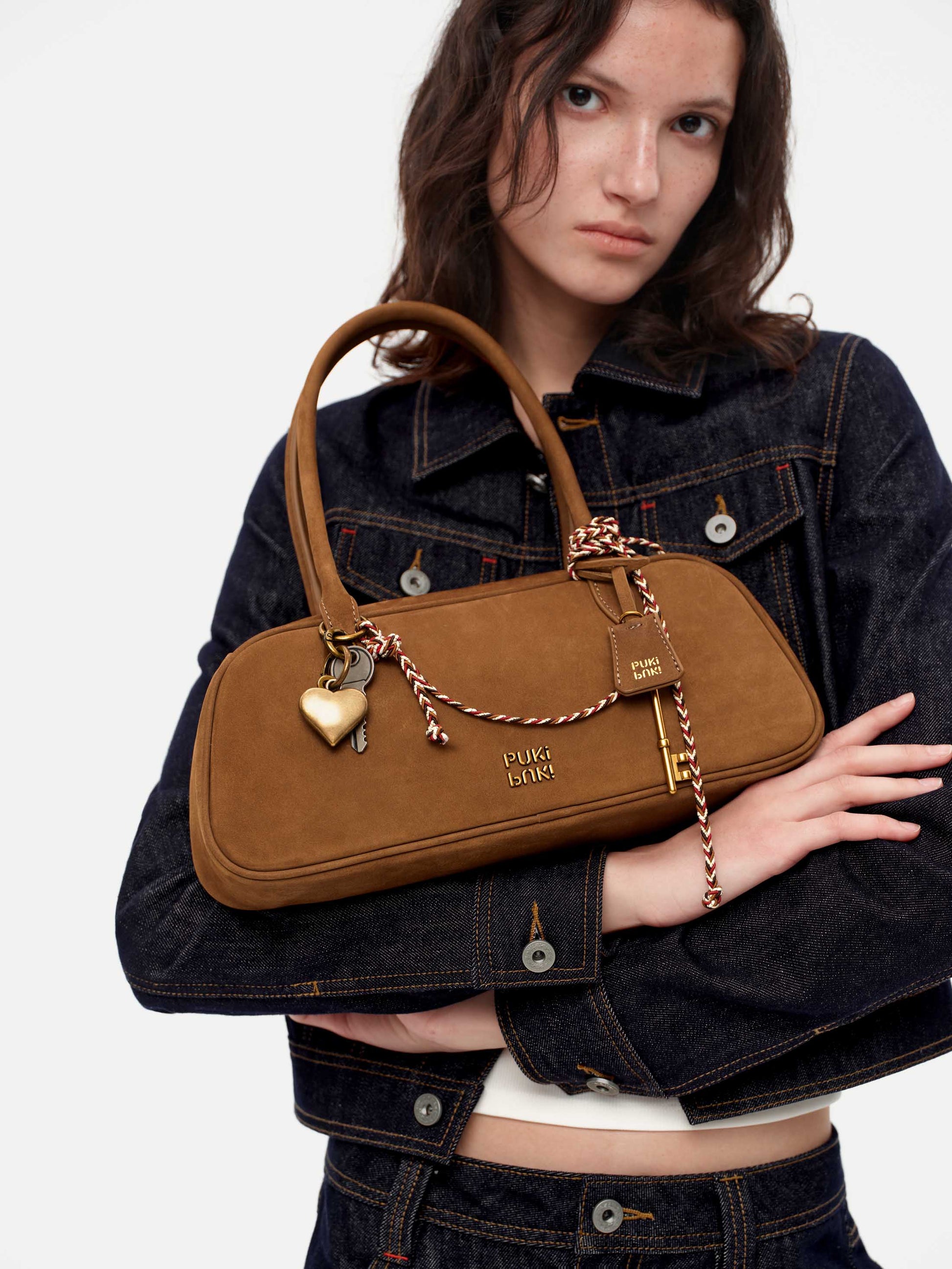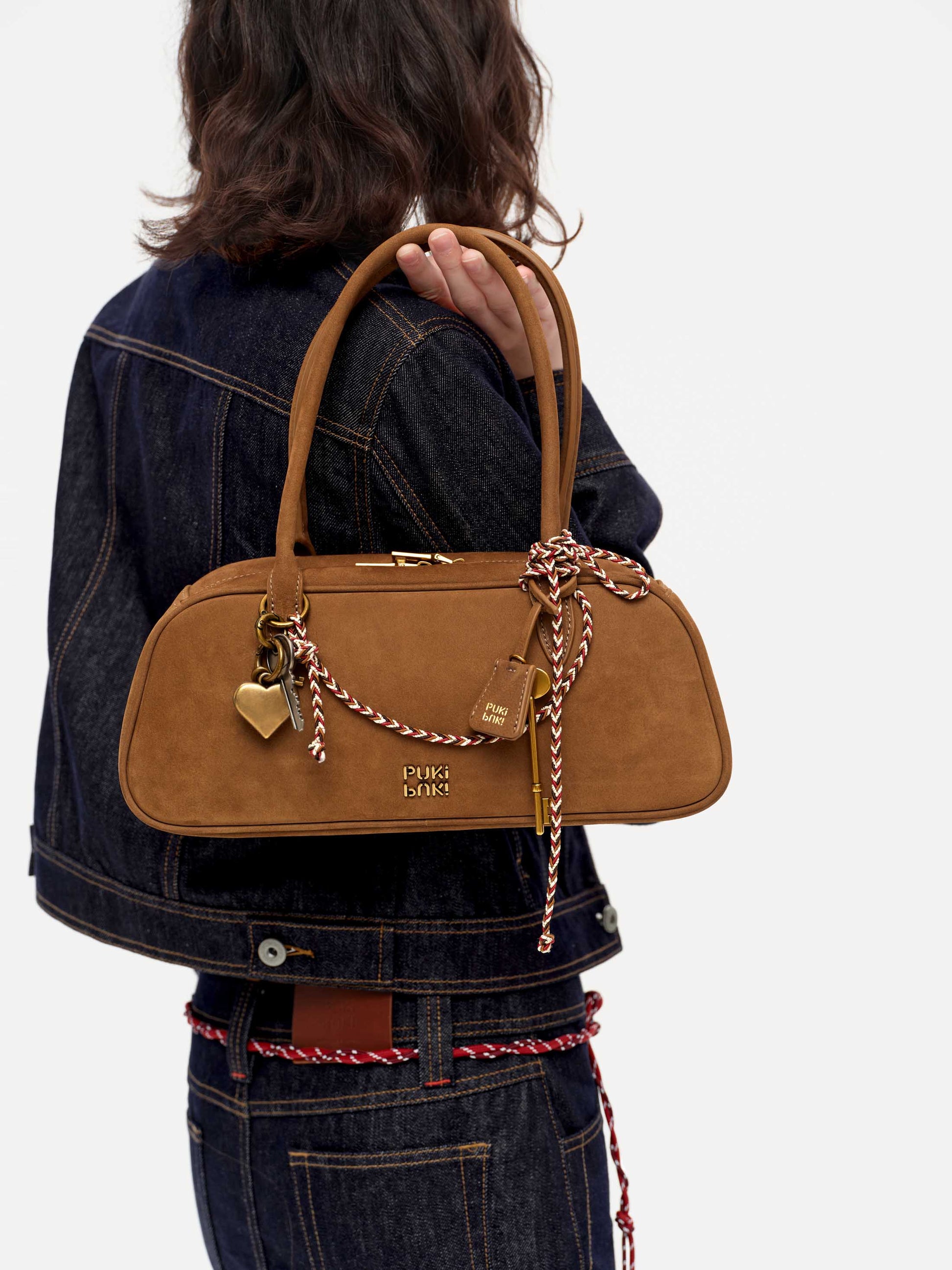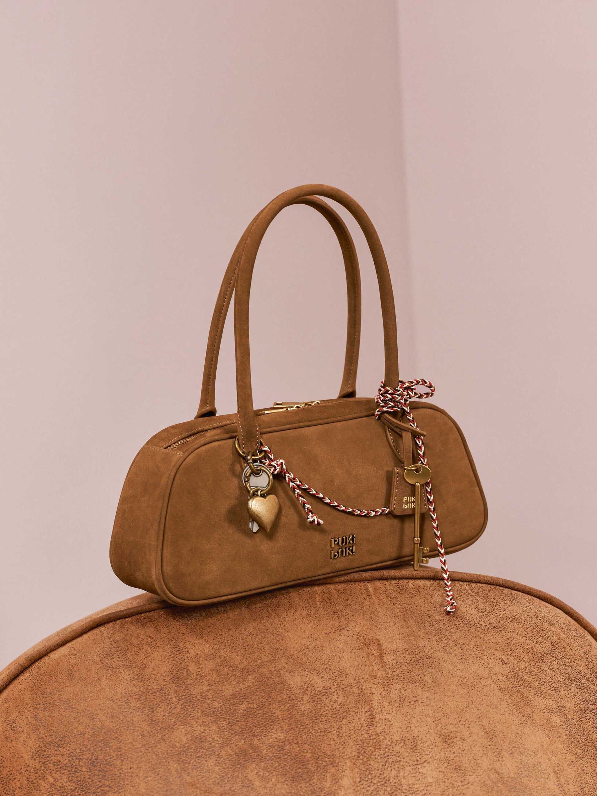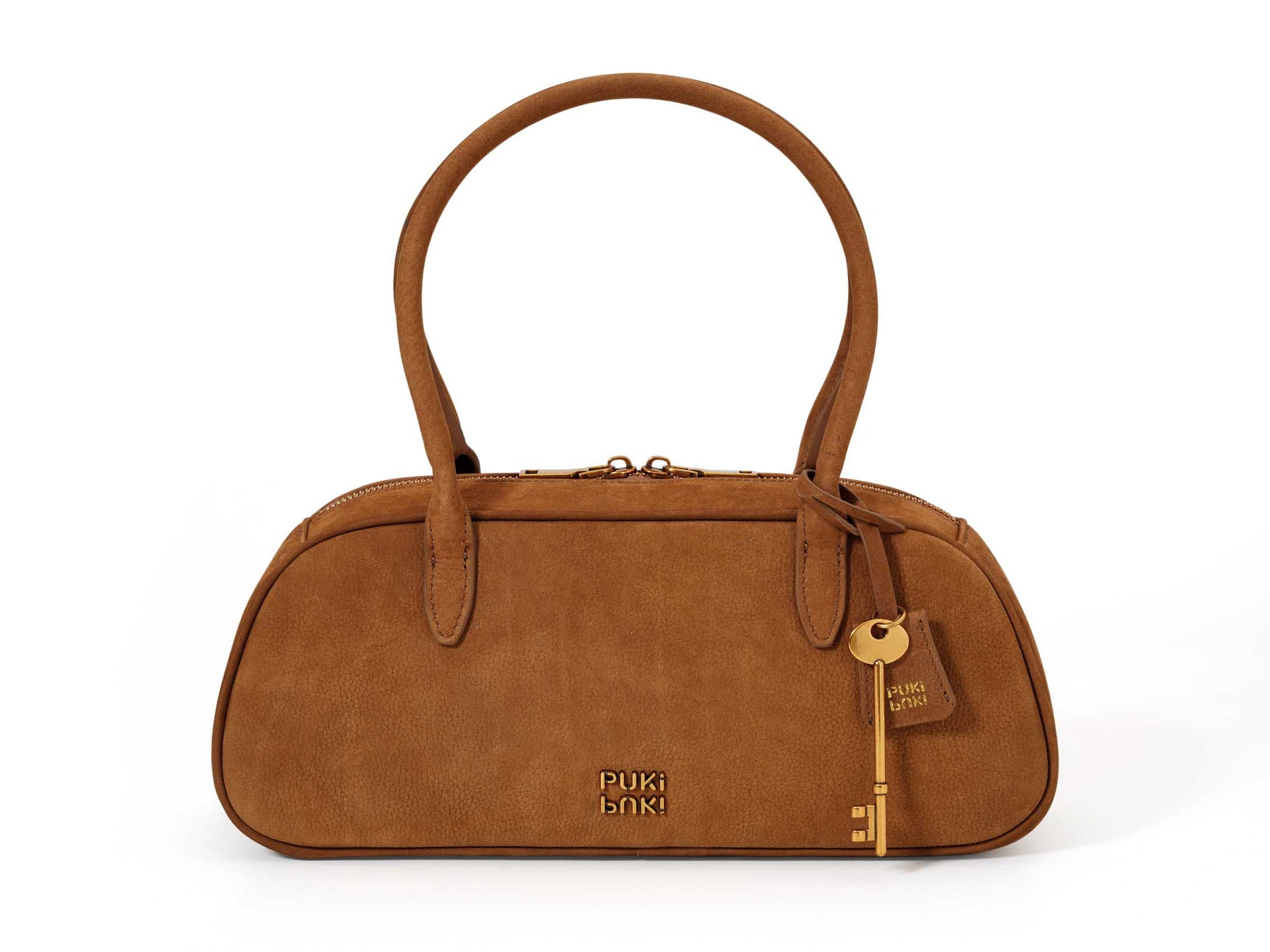 Material: Full-grain suede cowhide Boston bag with distinctive litchi-texture grain pattern. Lined in durable microfiber with antique brass hardware and custom metal zipper. Each piece features unique natural variations, combining tactile softness with structural integrity for everyday wear.