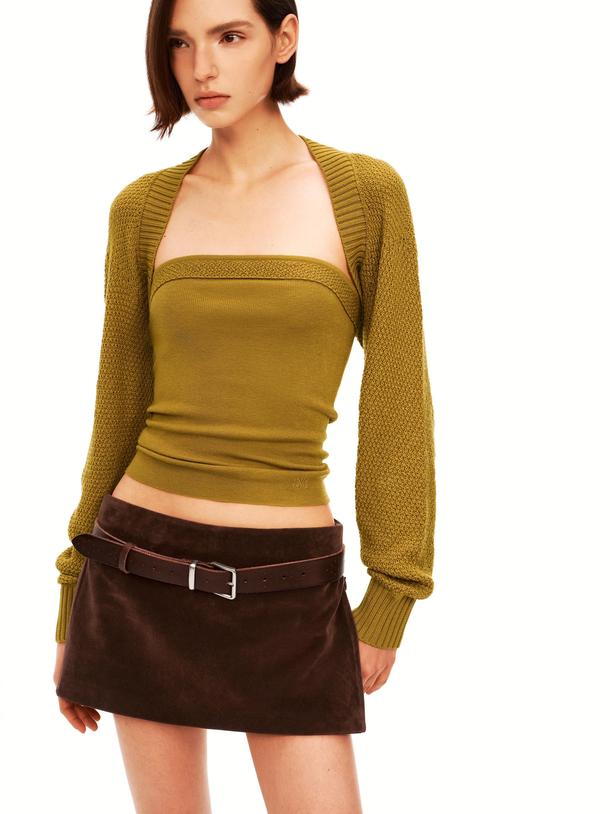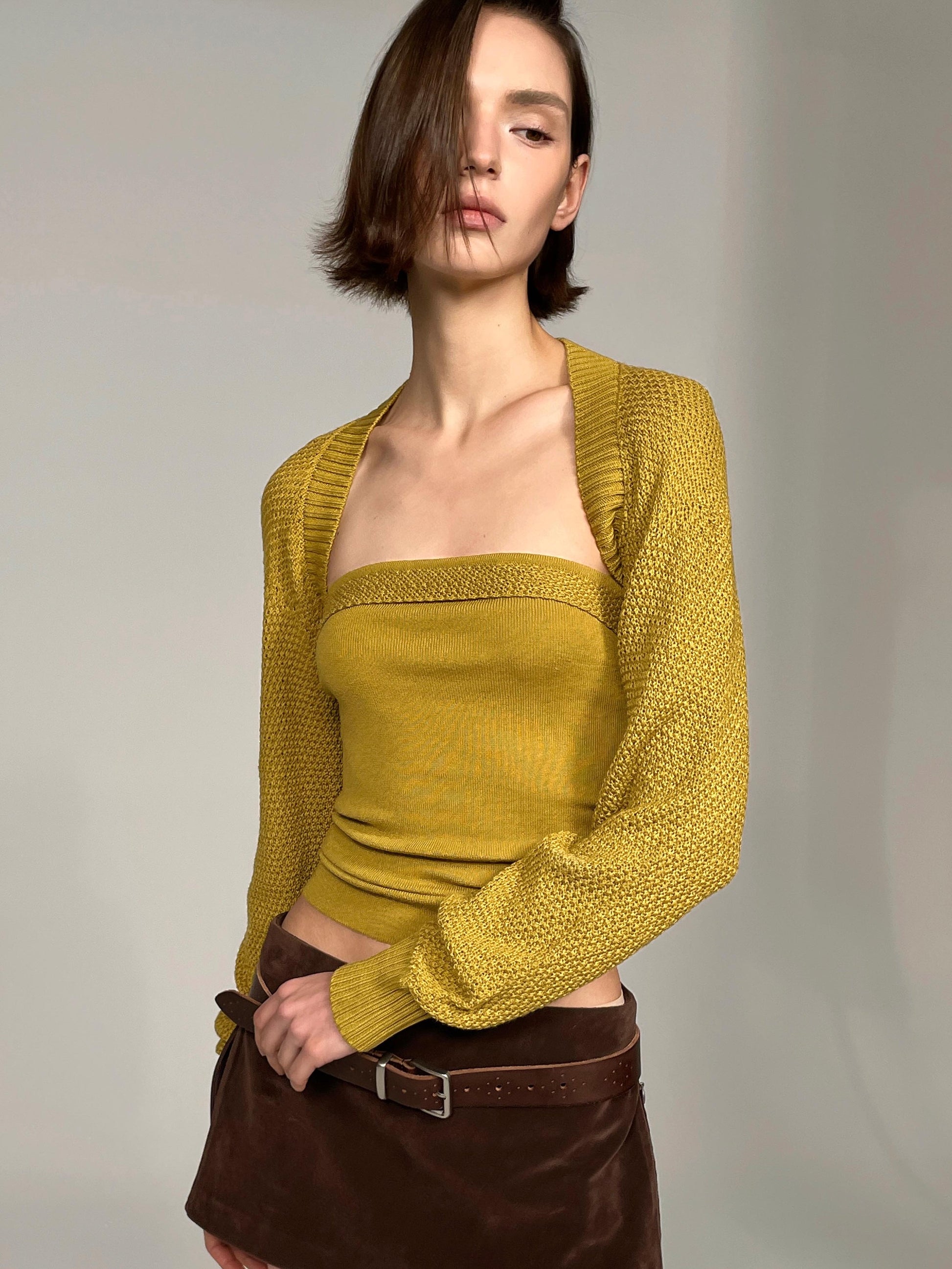 Quiet details: A sculpted ballet-inspired knit twin set composed of a cropped cardigan-style shrug and a slim tube top. The shrug is crafted in a 7-gauge knit with a trapezoid neckline that subtly opens the décolletage, while the 16-gauge tube top conforms to the body with gentle elasticity. Pineapple-stitch panels refine the bust line and edges, enhancing texture and dimension with quiet designer detail.